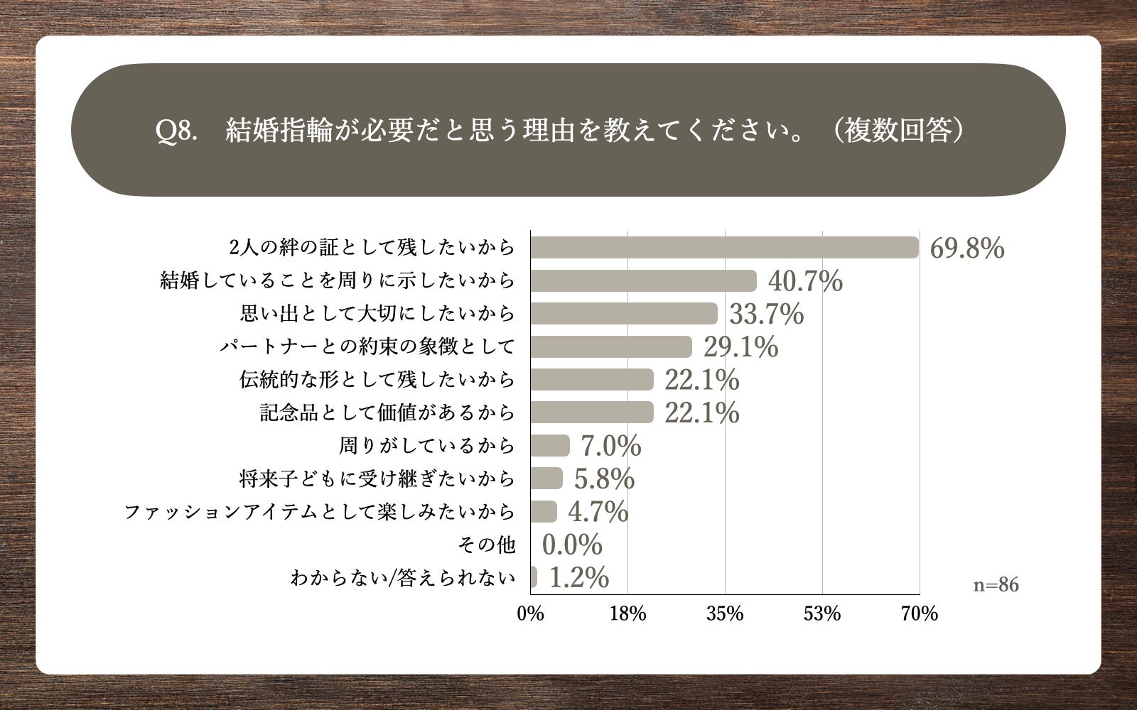 Q7で「非常にそう思う」「ややそう思う」と回答した方に、「Q8.結婚指輪が必要だと思う理由を教えてください。(複数回答)」(n=86)と質問したところ、「2人の絆の証しとして残したいから」が69.8%、「結婚していることを周りに示したいから」が40.7%、「思い出として大切にしたいから」が33.7%という回答となりました。