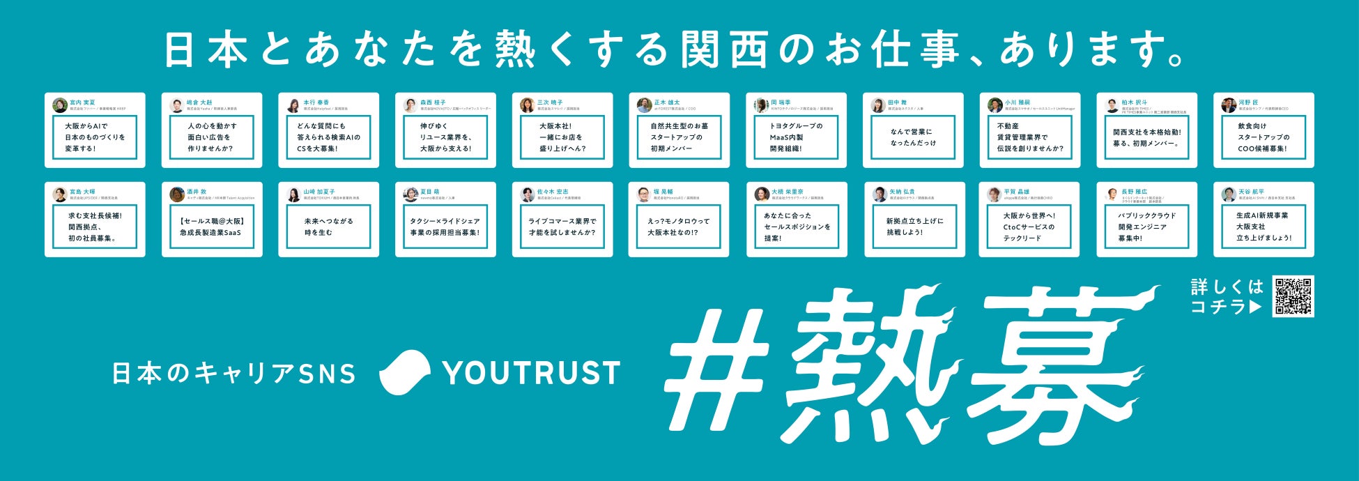 「#熱募」はYOUTRUSTが開発・運営するキャリアSNS「YOUTRUST」内に投稿された、勢いのあるスタートアップ企業の「熱い求人募集」をピックアップし掲載する屋外広告です。