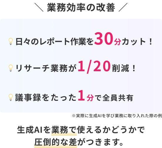 生成AIを業務で使えるかどうかで圧倒的な業務効率化が実現できます。