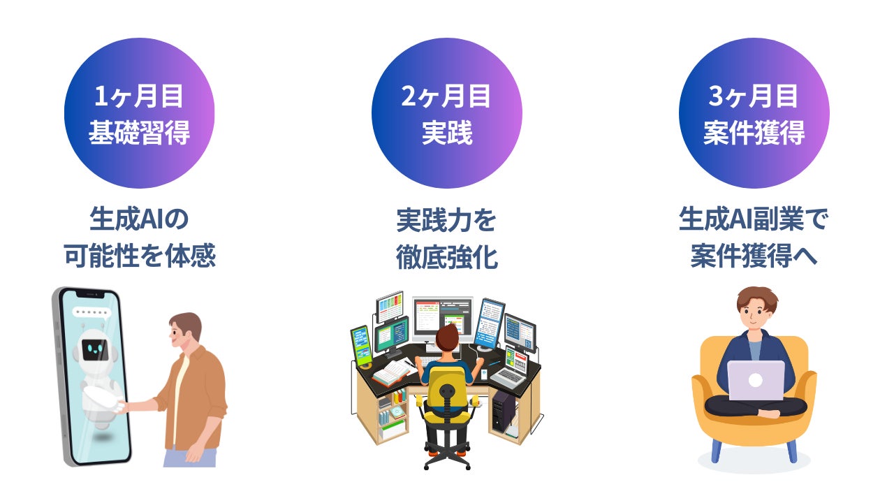 Tech Mentor生成AIでは、未経験から始める生成AIを活用して稼げる人材になるために、3ヶ月のプログラムを用意しております。
