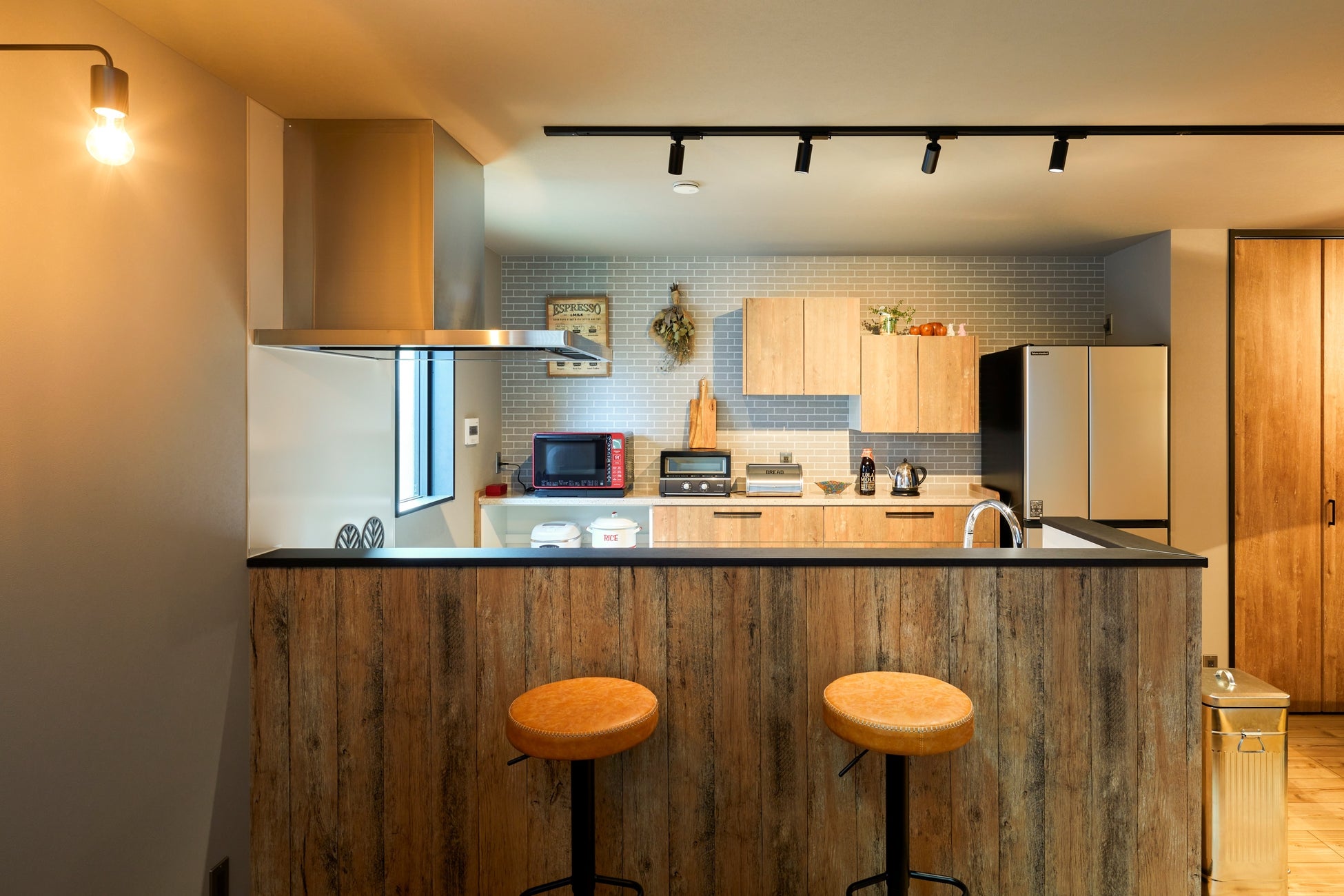 素材やインテリア、照明計画にもこだわり、お家全体にヴィンテージ感を散りばめました。吹き抜けの開放感や、室内窓の抜け感も合わさり、オシャレさと居心地の良さが両立しています。