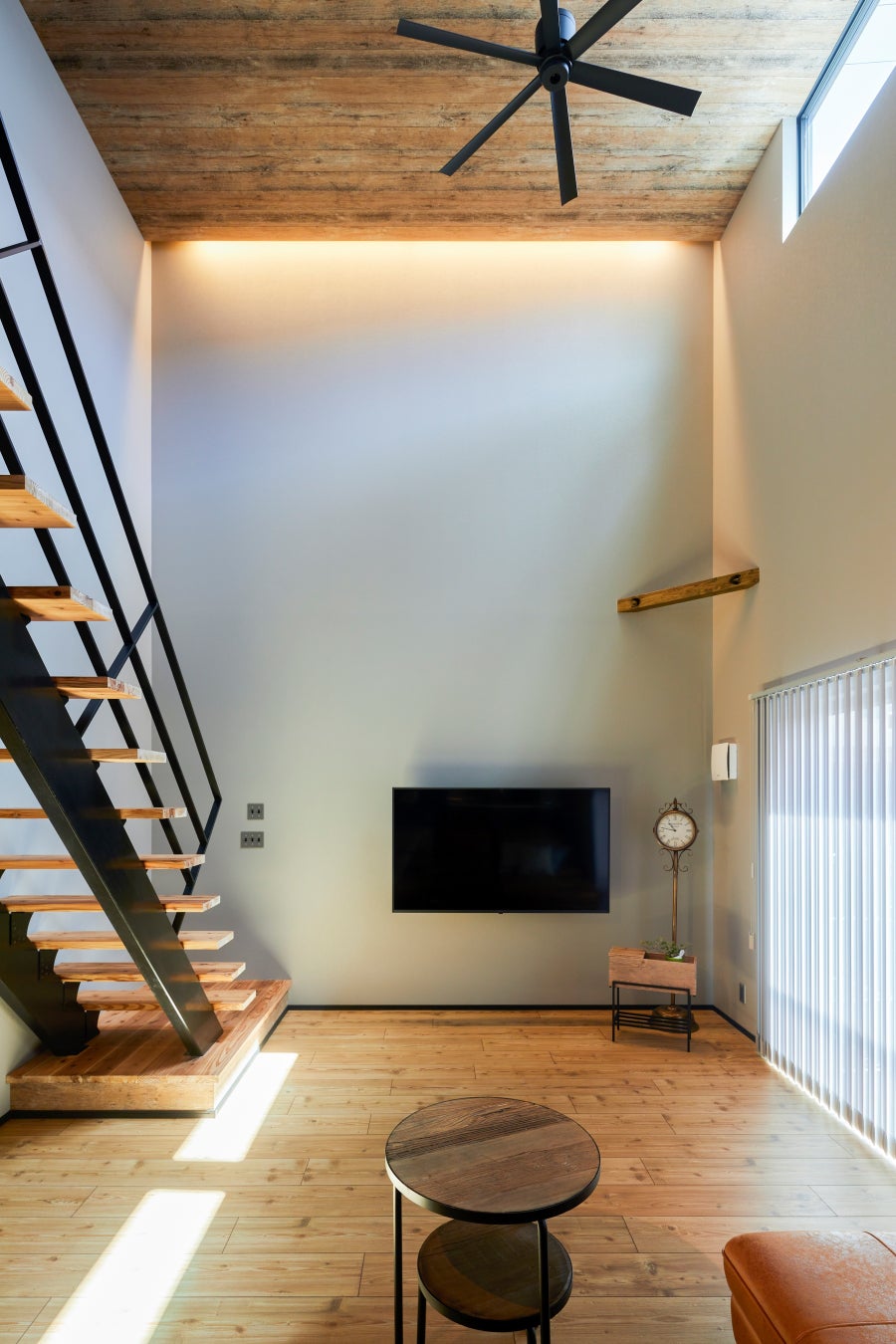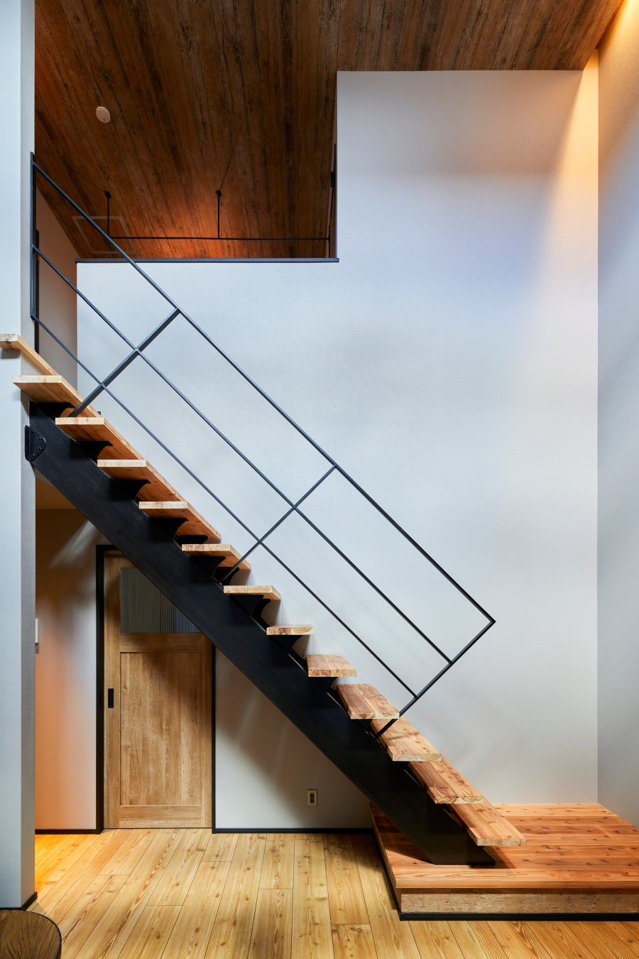 天井にはナチュラルで落ち着いた雰囲気のウッド調と、間接照明を設置することで高級感を演出しています。LDKのメインにもなるスケルトン階段は、形状に合わせて取り付けた斜めの手摺がこだわりポイント。階段の踏板には、屋久島杉の無垢材を採用しています。
