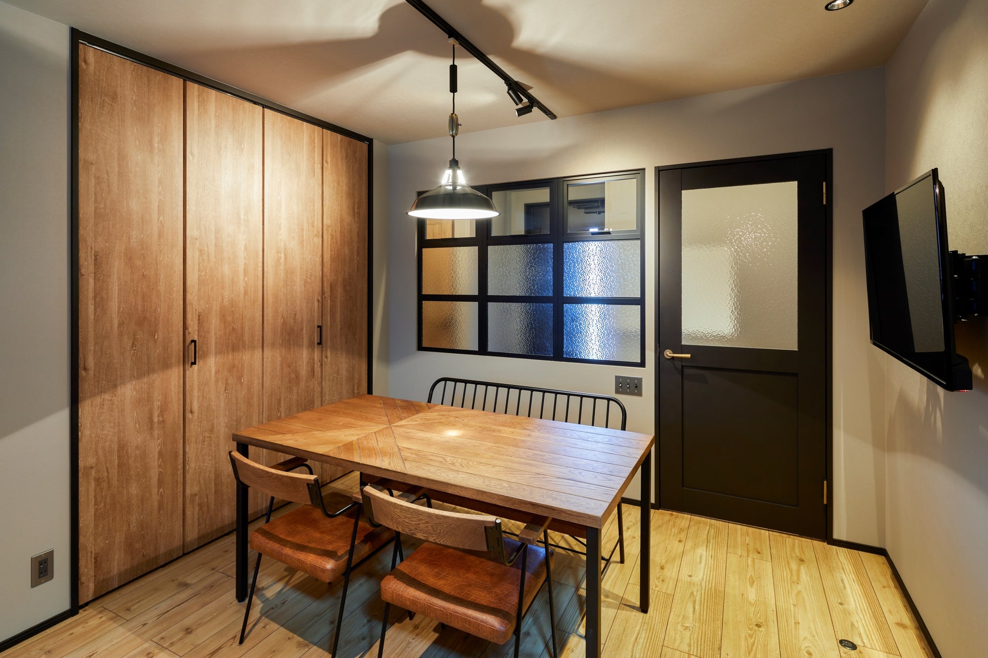 ブラック×グレーをメインにブラウンを取り入れた室内。木材とアイアン素材でアメリカンに、古材やアイアンエイジング加工された家具などを採用することでヴィンテージ感をプラスしています