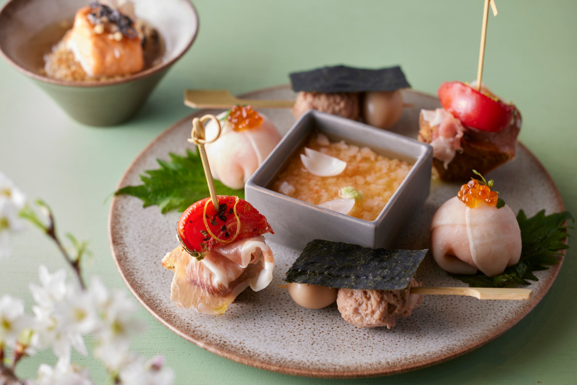 グッドエッグアワード受賞の放牧卵「福が、きた」を使ったバームクーヘンのピンチョスは、生ハムと甘味豊かな小山町産アメーラトマトの自家製セミドライトマトを添え、爽やかなレモンオイルで仕上げました。地元小山町産のアトランティックサーモンと蕪の甘酢漬けを合わせた一口サイズの手まり寿司は、ほどよい酸味がサーモンの旨味を引き立てます。なめらかな冷製茶わん蒸しは、海老のおぼろ餡をかけた上品な味わい。富士山御殿どり特製つくねと鶉の卵の串は、ジューシーな鶏の旨味と海苔の風味を楽しめます。香ばしく焼いた小山町産アトランティックサーモンと玄米の焼きおにぎりに、塩昆布と鰹節を添え、6種類からお好みのお茶を回しかける贅沢なお茶漬けもご用意しました。