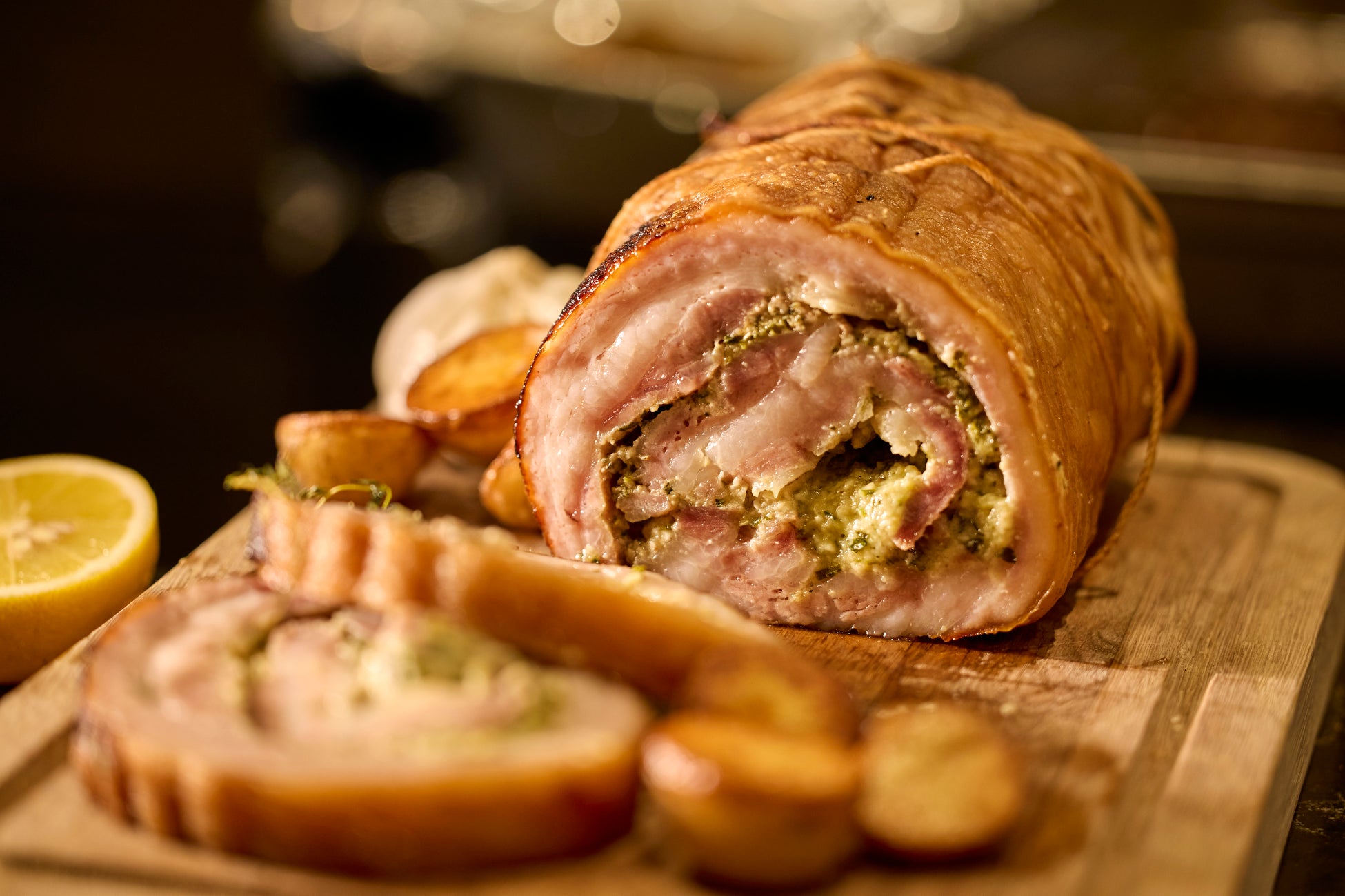 メインの“ポルケッタ”は、静岡県産オリーブオイルの搾りかすを食べて育った臭みのない豚肉を使用し、イタリア伝統のローストポークに仕上げました。ローストガーリック、ローズマリー、タイム、レモンゼストなどをブレンドした香草ペーストを丁寧に塗り込み、巻き上げて真空調理。90℃で120分じっくり火を入れることで、しっとりとした食感とジューシーな味わいを実現しました。ローストした新じゃがや、ディジョンマスタードとガーリックを効かせたアイオリソースが、肉の旨味をさらに引き立てます。