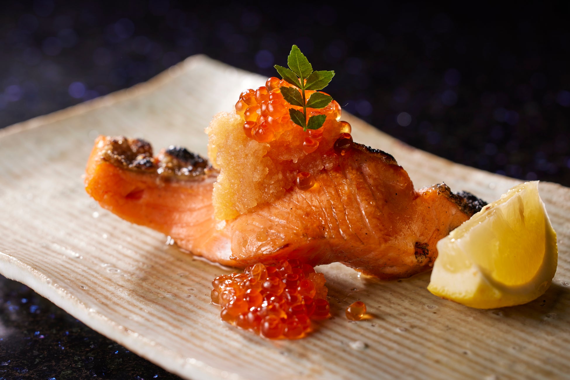 OMIKAコースでは、ホテルから車でわずか7分の距離にある陸上養殖場で育てられた、鮮度抜群のアトランティックサーモン「FUJI ATLANTIC SALMON」を炭火で香ばしく焼き上げ、いくらと大根おろしを添え、地元の天野醤油とともに仕上げました。ほどよい塩味と濃厚な旨味が絶妙に調和する、贅沢な一皿をお楽しみください。