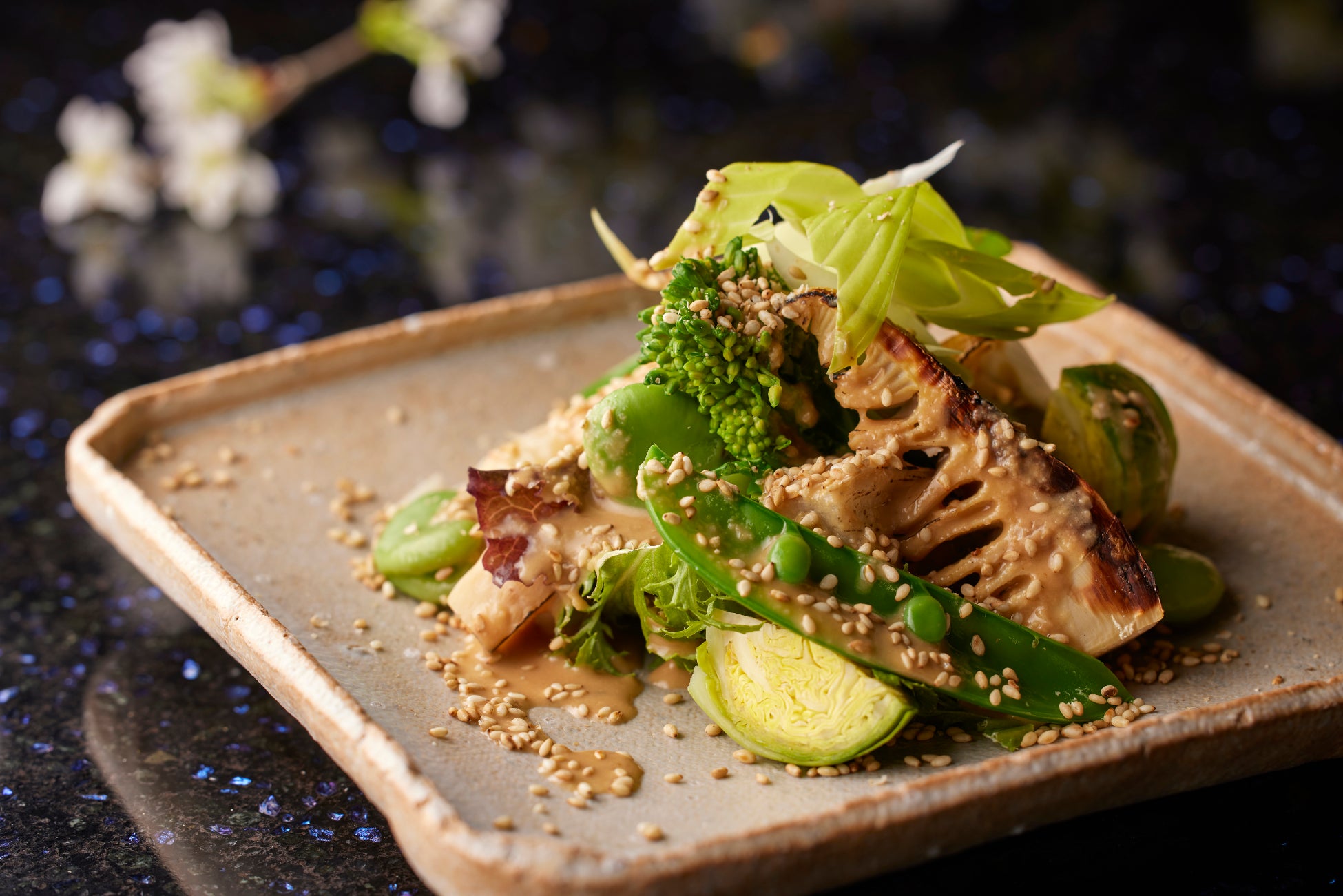 OYAMAコースとFUJIコースでは、春を感じる焼き筍と季節野菜のサラダ仕立てをご提供。あっさりと炊き上げた筍を炭火で炙って香ばしさを引き立たせ、スナップエンドウやそら豆などの春らしい豆類を彩り豊かに添え、和風の胡麻ドレッシングとたっぷりのすり胡麻が芳醇な香りを引き立てます。シャキシャキとした筍の食感と、まろやかな胡麻の風味が口いっぱいに広がる一品です。