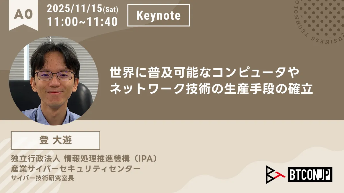 【 #BTCONJP 2025】登大遊氏による基調講演の詳細が確定、テーマは「世界に普及可能なコンピュータやネットワーク技術の生産手段の確立」