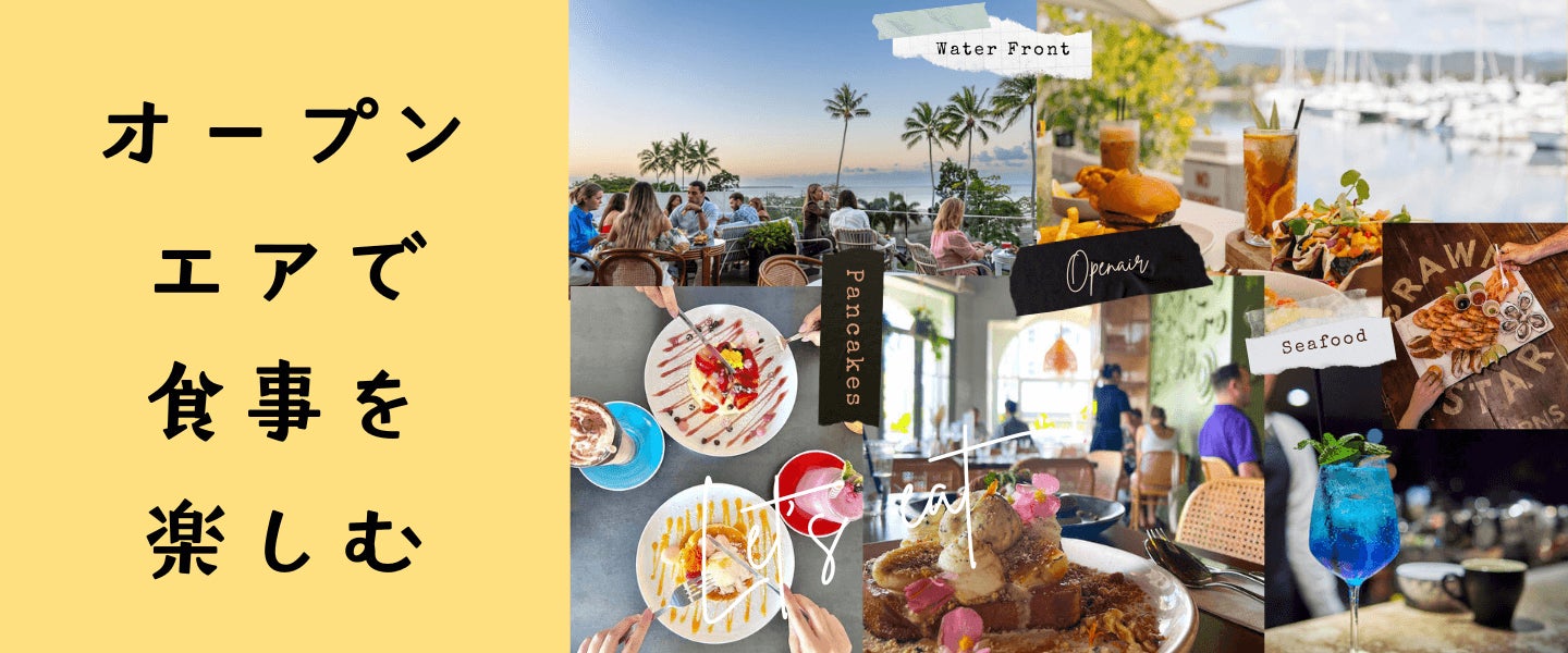 早朝からオープンしているため到着日に行くことも可能な「海を見ながらカフェでのんびり」したり、オージービーフ、シーフード、イタリアンなど、ケアンズの3大料理を楽しめる「ウォーターフロントで食事」したりと、ケアンズは心地よい風に吹かれながら食事をすることも一般的です。一杯のコーヒーでも豆から挽いてくれたり日本に持ち帰り用の豆が買えたりするカフェも多い「ケアンズっ子にも人気のコーヒー」を楽しみ、イタリア人の移民が多いケアンズならではの「本場のイタリアンを堪能」し、食の品質と安全に厳しいオーストラリアで育った「オージービーフ」だけでなく、食べると証明書をくれるレストランもある「クロコダイルやエミューに挑戦」するなど、地産地消を心がけ新鮮な食材を提供するお店が多いケアンズの食の魅力も存分にご紹介します。