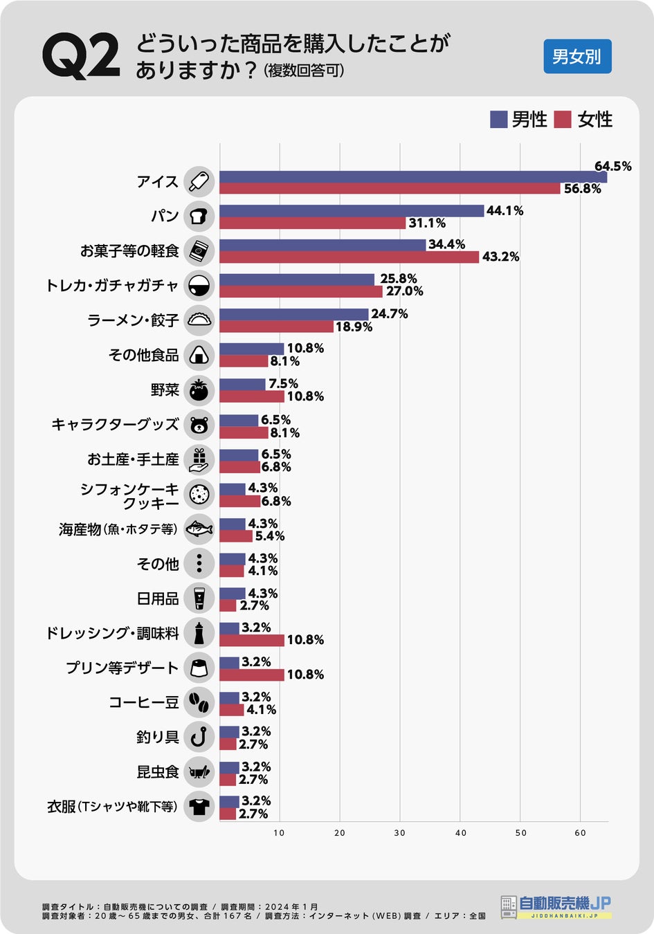 【自販機に関する調査②】飲料以外では、どういった商品を購入したことがありますか?男女別でも調査
