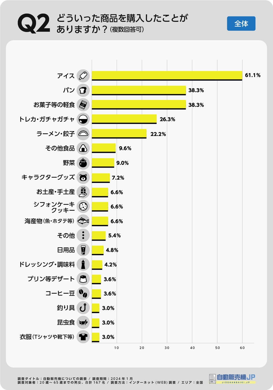 全国の20歳~65歳までの男女167名を対象にアンケート調査をおこなったところ、回答者の半数以上(61.1%)が自動販売機でアイスを購入した経験があるという結果になりました。次いで「パン」や「お菓子等の軽食」が共に38.3%の購入率で続き、「トレカ・ガチャガチャ」が26.3%、「ラーメン・餃子」が22.2%となっており、これらがトップ5に挙げられます。