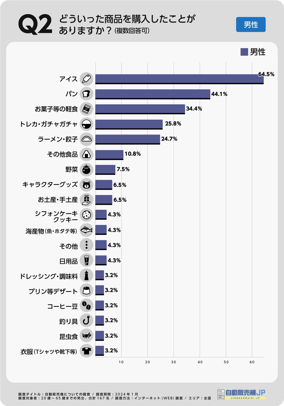 最も多く購入されているのはアイス(64.5%)、続いてパン(44.1%)となっており、これらは日常生活での即時消費に便利な商品です。トレカやガチャガチャにも一定の人気があり(25.8%)、ラーメンや餃子などの食事代替商品も購入率が高い傾向です(24.7%)。他の食品類の購入率は比較的低めであり、特にデザート類の購入はまだ一般的ではないようです。