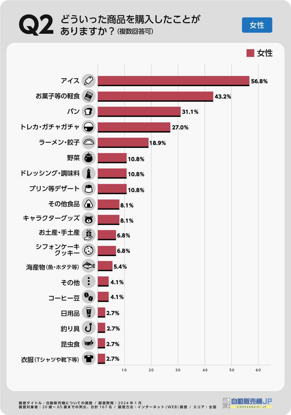 女性の回答だとアイスが最も人気で(56.8%)、お菓子類が(43.2%)の購入率を示しています。日常の食品であるパンも(31.1%)、ラーメンや餃子も(27.0%)となっており、男性と比較してそこまで大きく購入率の差が開きませんでした。ただし、「ドレッシング・調味料」や「デザート」においては男性より購入率が高い結果になっています。