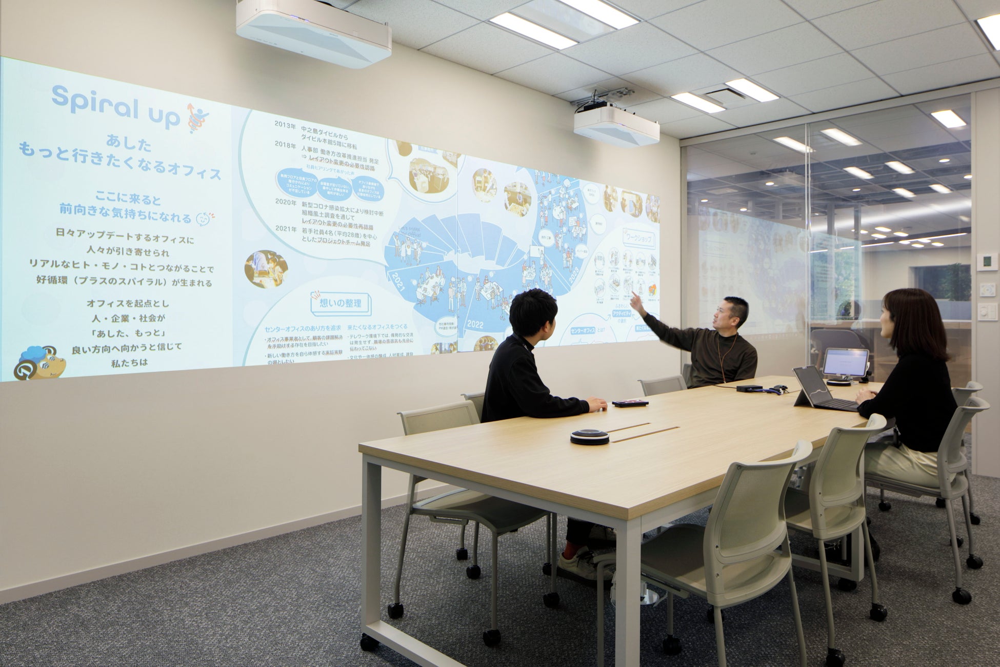 「前向きな気持ちを持った人々がオフィスに引き寄せられ、リアルなヒト・モノ・コトとつながることで、好循環(プラスのスパイラル)が生まれる。オフィスが起点となり、人・企業・社会が「あした、もっと」良い方向へ向かう」との想いで、センターオフィス(本社・支社等の機能を持つオフィス)のあり方を追求していくオフィスを構築しました。
