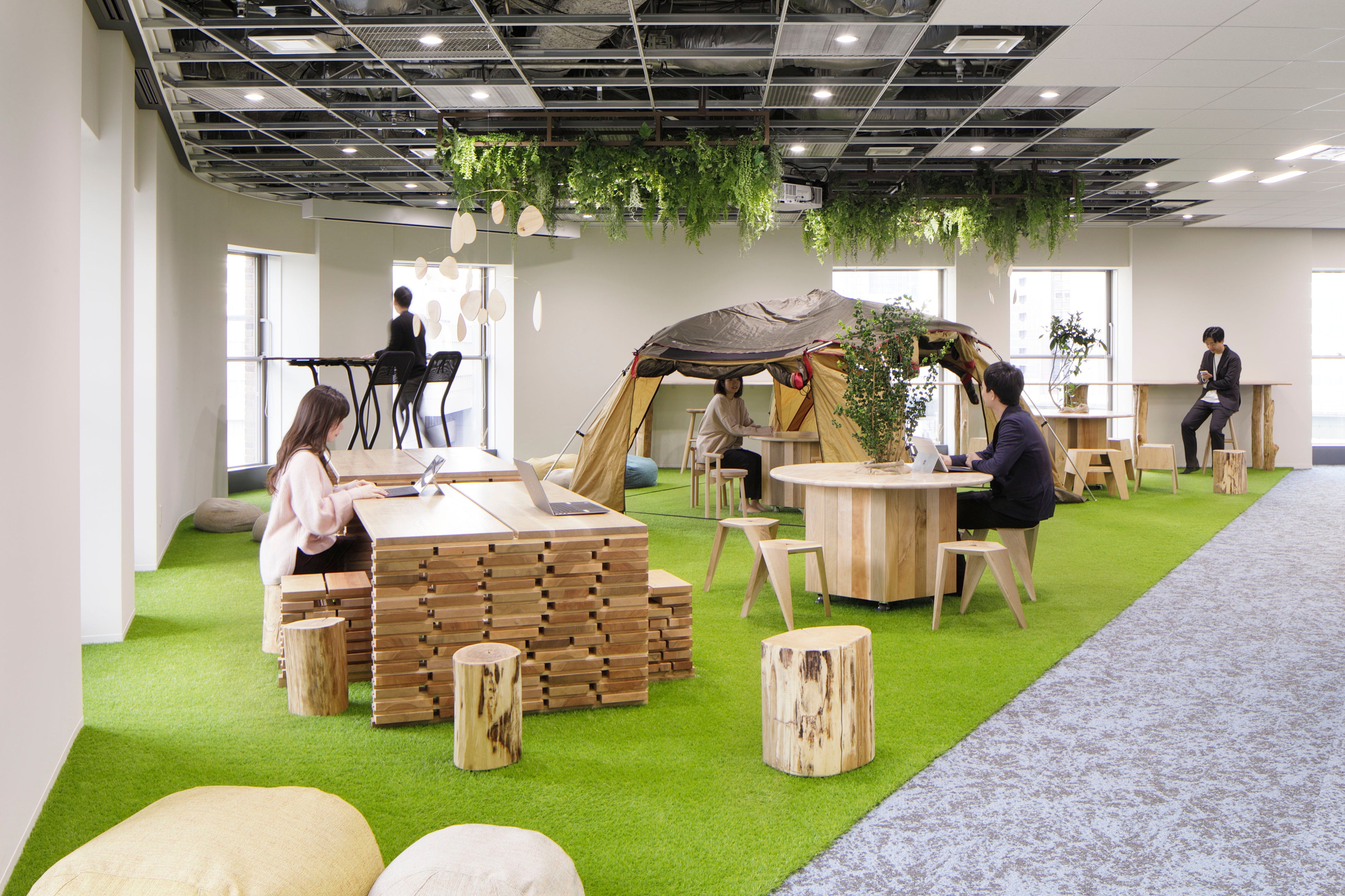 デザインコンセプトとして人と人を重ねて接点を作る「マンナカ」(緑色)、働き方や関係性を深める「マワリ」(白色)を配置するなどして、社員同士の新しい”接点”が生まれる空間としました。