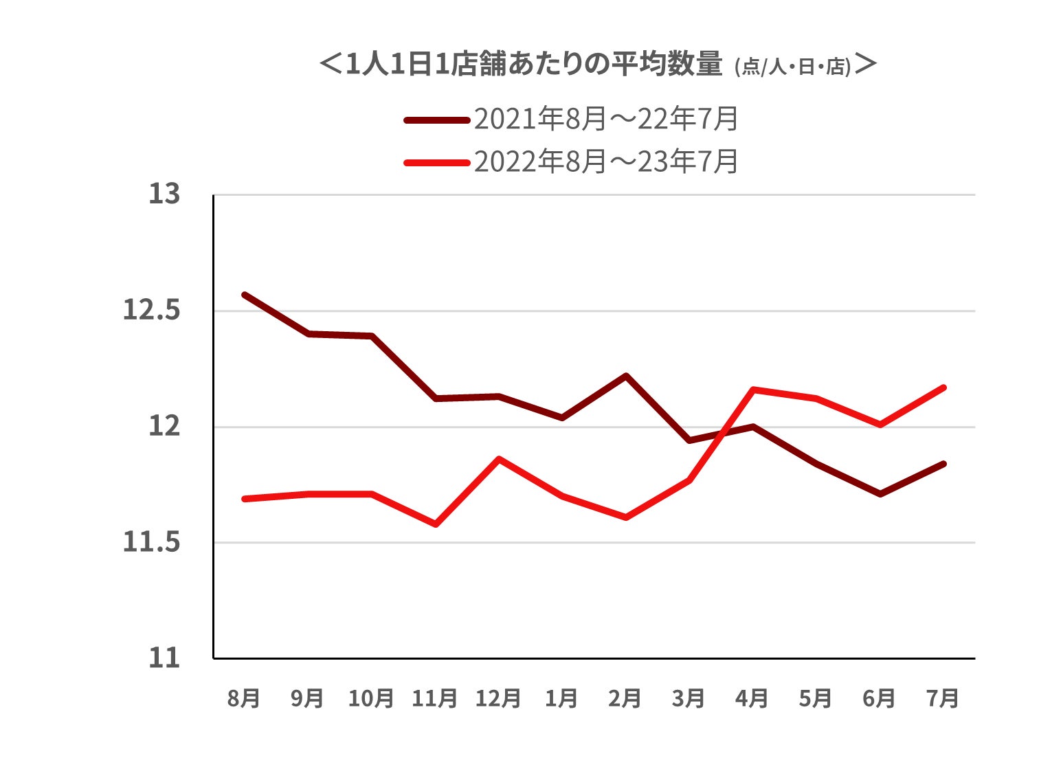 平均購入金額を構成するそれぞれの要素を見てみると、7月の平均単価は前年同月比約3.4%(約+7.5円)増、前月比約2.1%(約+4.7円)増、平均購入数量も同様に約2.8%(約+0.3点) 増、約1.3%(約+0.2点) 増加しております。