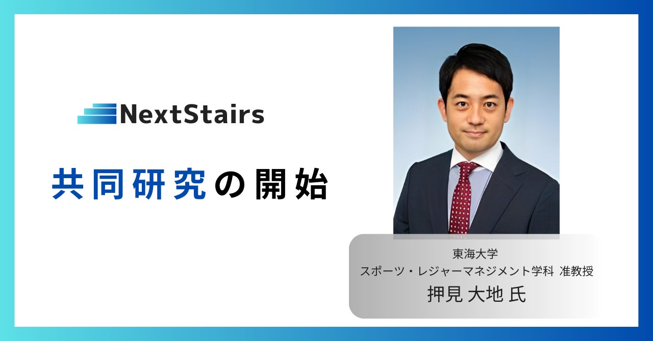 株式会社NextStairs(ネクストステアーズ 本社:福岡県福岡市中央区、代表取締役 CEO:万井拓馬/マンイタクマ)は、スポーツチーム・イベントの社会的価値を応用し、マーケティング強化することを目的に、東海大学 スポーツ・レジャーマネジメント学科 准教授の押見 大地氏との共同研究を開始したことお知らせいたします。スポーツの社会的価値の分析、特にSROI(社会的投資収益率)分析に精通する同氏の深い知見を生かし、今後、スポーツチームやイベントの社会的価値の向上を目指したプロジェクトを推進してまいります。