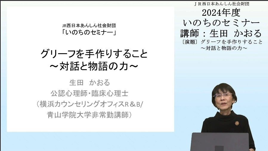 今年度第4回目の「いのちのセミナー」(WEB配信)は、公認心理師・臨床心理士の生田 かおる氏を講師にお迎えし、講師の経験を踏まえた「つながりの力」「対話がもたらすもの」によって、喪失の意味をみつけ、別な自分になっていくプロセスなどのお話を通じ、自身や他者のグリーフとの向き合い方について考える機会を提供させていただきます。皆様のご視聴を心よりお待ちしております。