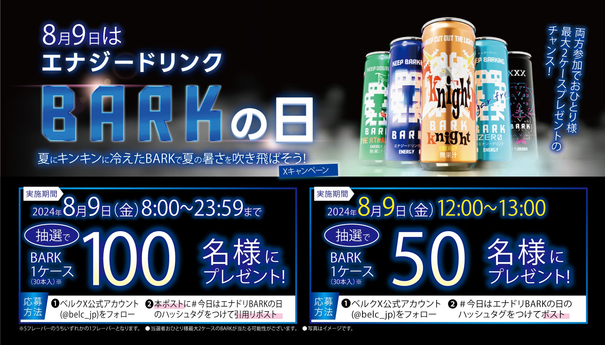 さらにベルク公式Xアカウント(@belc_jp)をフォローのうえ、8月9日(金)12時~13時の間に #今日はエナドリBARKの日 のハッシュタグをつけてポストいただいた方の中から抽選で50名様にBARK1ケース(30本入)(5フレーバーのうちいずれか1フレーバー)」をプレゼントいたします。