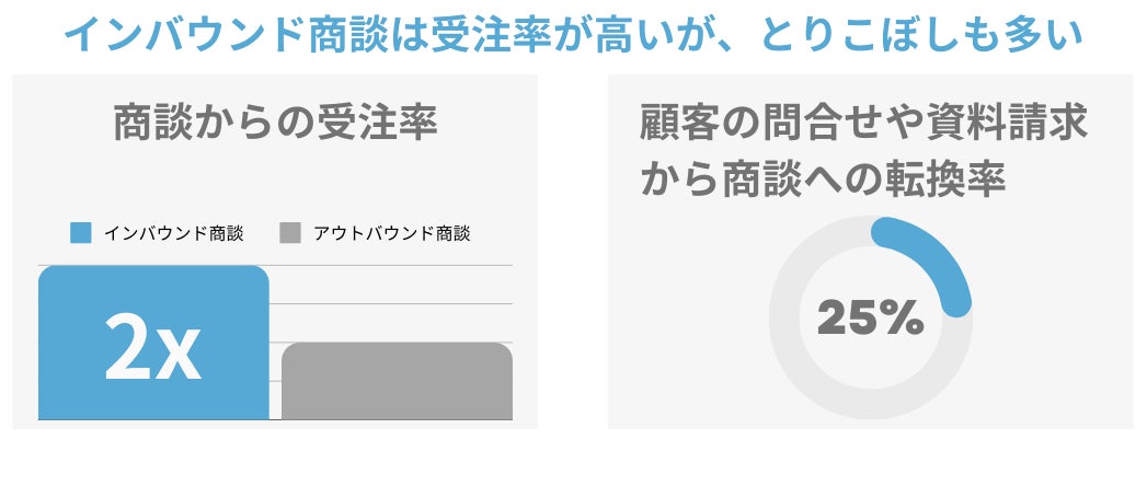 B2B事業におけるWebマーケティングの広がりを受け、顧客の問合せや資料請求から設定されるインバウンド商談の重要性が高まっています。顧客のアクションを起点にするインバウンド商談においては、営業からのアクションで設定されるアウトバウンド商談と比べて、受注率が約2倍高くなることが分かっています(*1)。