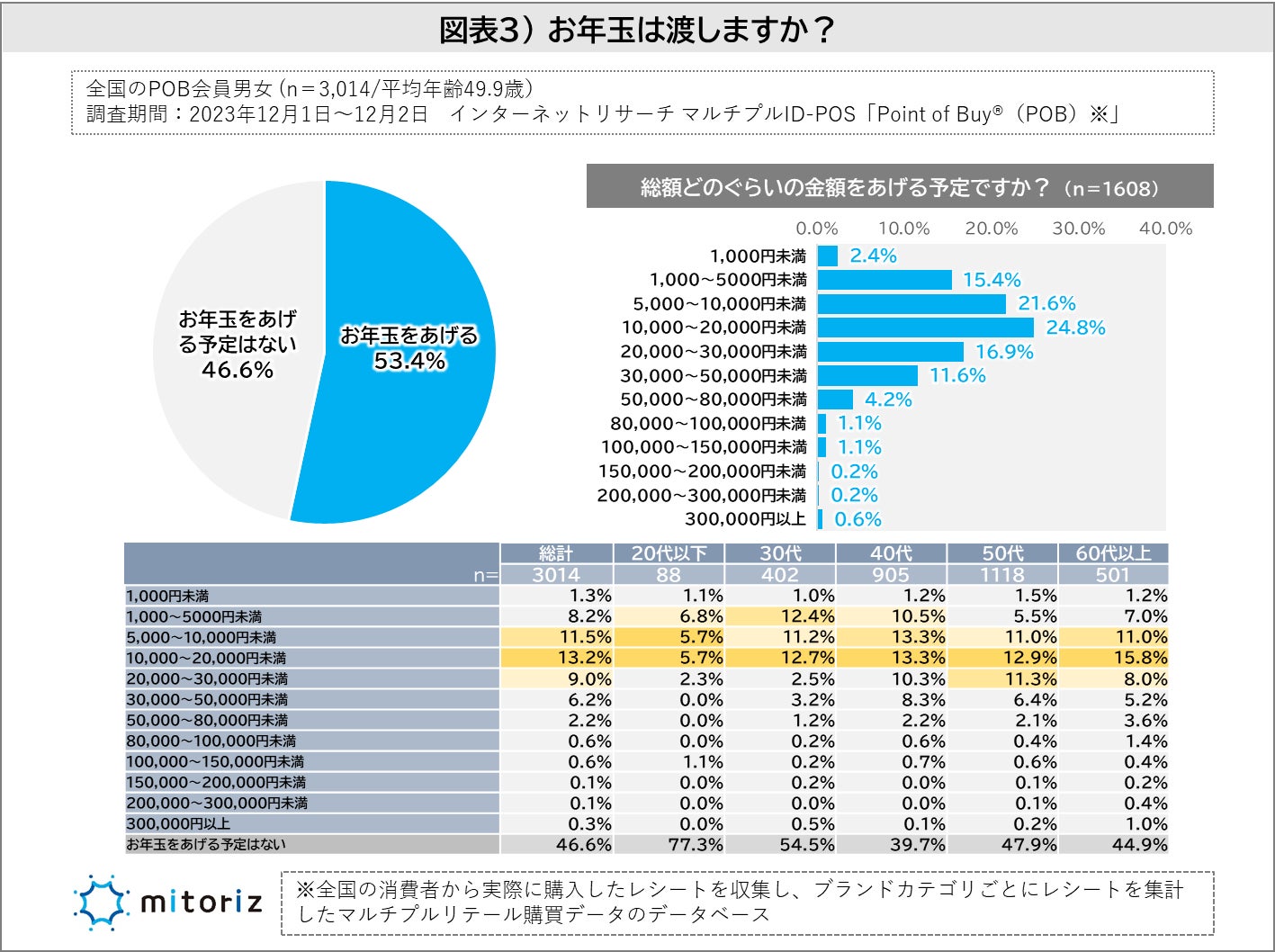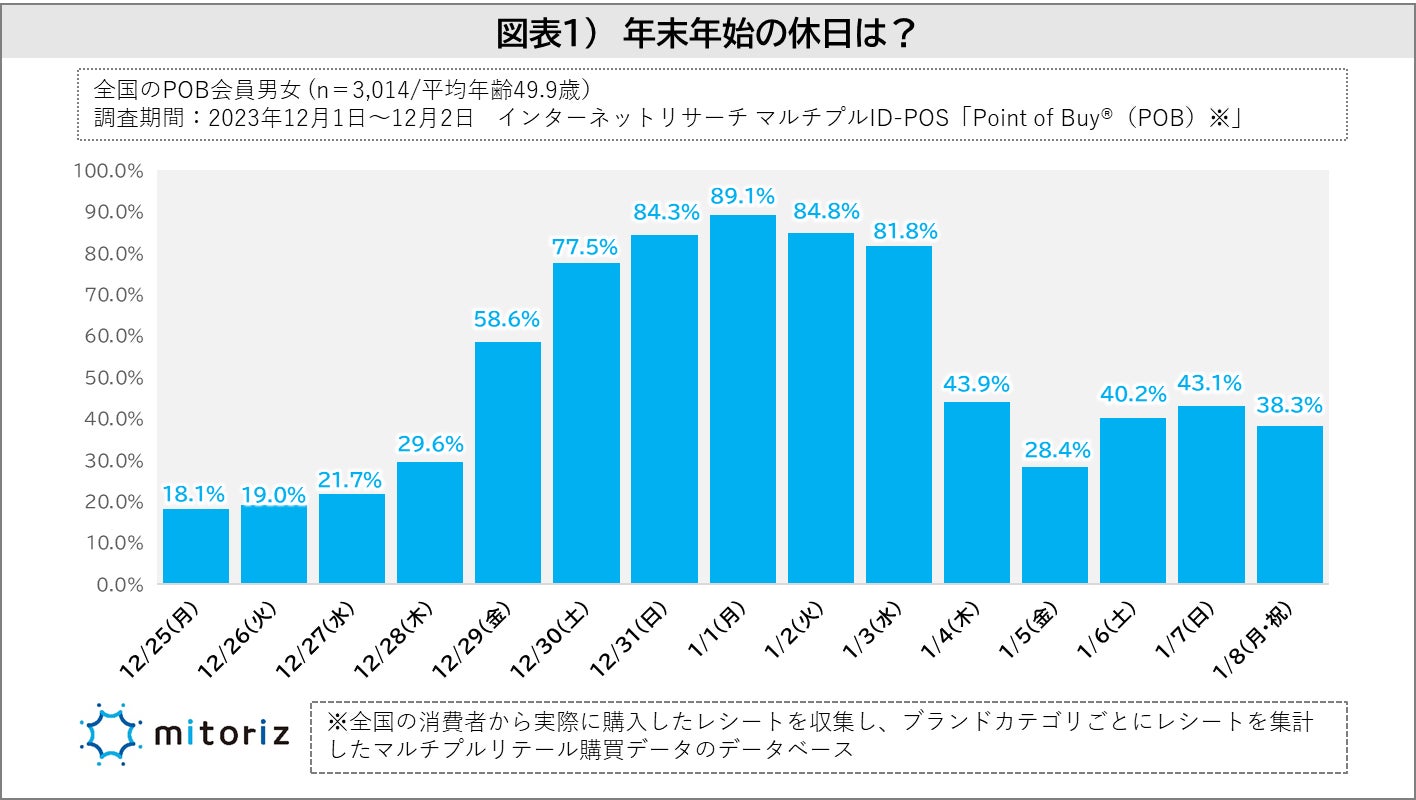 株式会社mitoriz(本社:東京都港区、代表取締役社長:木名瀬博)は、消費者購買行動データサービス「Point of Buy®(以下、POB)」の会員3,014人に「年末年始に関する過ごし方に関する調査」を実施致しました。