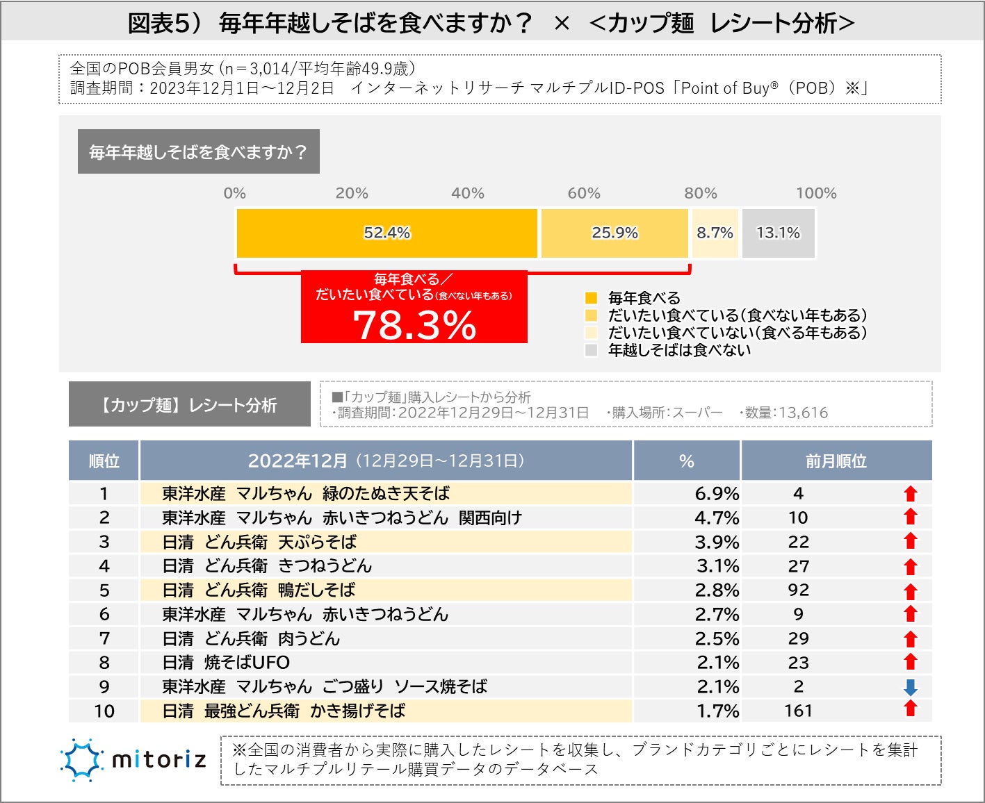 年越しそばを「毎年食べる/だいたい食べている(食べない年もある)」と回答したのは78.3%でした。レシートデータで年末3日間(2022年12月29日~31日)の「カップ麺」カテゴリを分析したところ、前月の上位10商品はカップヌードル等の定番商品が並び、そばは1商品のみですが、この3日間は10位以内の4商品がランクインしており、年越しそば用にカップ麺の購入が増えている様子がわかります(図表5)。