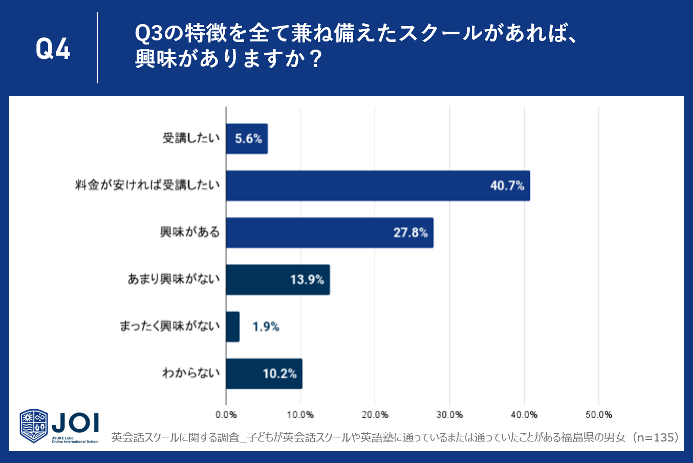 Q4で「Q3の特徴を全て兼ね備えたスクールがあれば、興味がありますか?」と質問したところ、福島県では5.6%が受講を希望し、40.7%は料金が手頃であれば受講したいと考えています。さらに、27.8%は興味を示していると回答しました。多くの人がこのような特徴を持つスクールに一定の興味を示していることが分かります。