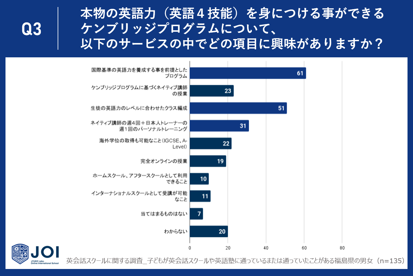 Q3で「本物の英語力(英語4技能)を身につける事ができるケンブリッジプログラムについて、以下のサービスの中でどの項目に興味がありますか?(複数回答可)」と質問したところ、福島県で最も多かったのは「国際基準の英語力を養成する事を前提としたプログラム」で61名でした。次いで、「生徒の英語力のレベルに合わせたクラス編成」には51名、「ネイティブ講師の週4回+日本人トレーナーの週1回のパーソナルトレーニング」には31名が興味を持っています。一方で、「インターナショナルスクールとして受講が可能なこと」や「ホームスクール、アフタースクールとして利用できること」に関心を持つ人はやや少なめで、それぞれ11名、10名の回答でした。これらの結果から、多くの人は実用的な英語力の養成や個別のニーズに応じた指導に重きを置いていることが伺えます。
