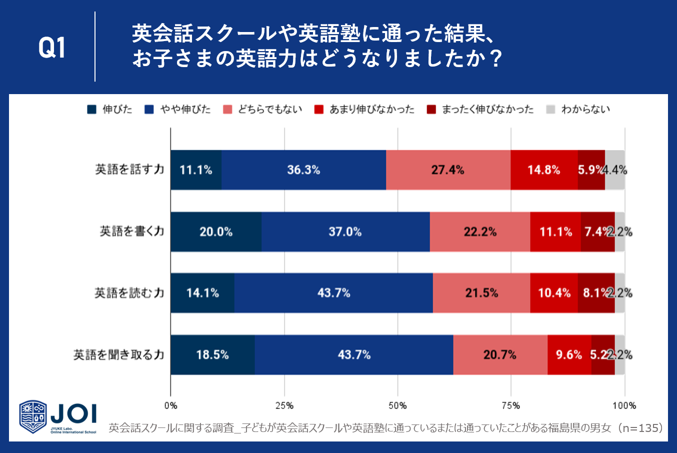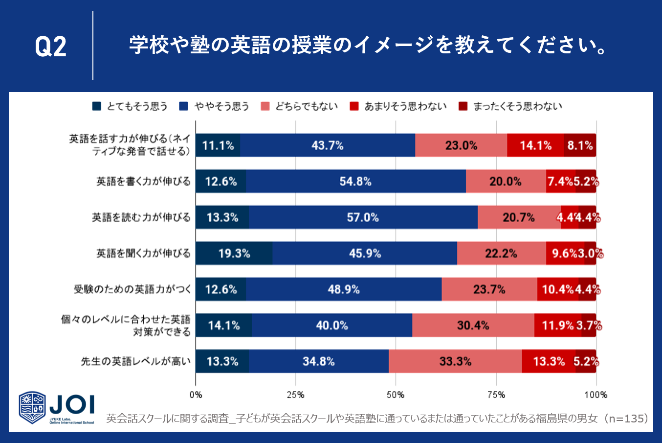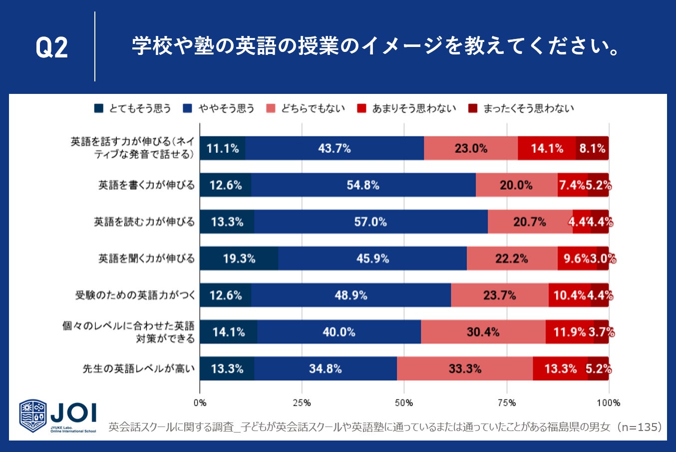 今回は、子どもが英会話スクールや英語塾に通っているまたは通っていたことがある福島県の男女135人に、英会話スクールや英語塾の効果に関するアンケート調査を実施しました。
