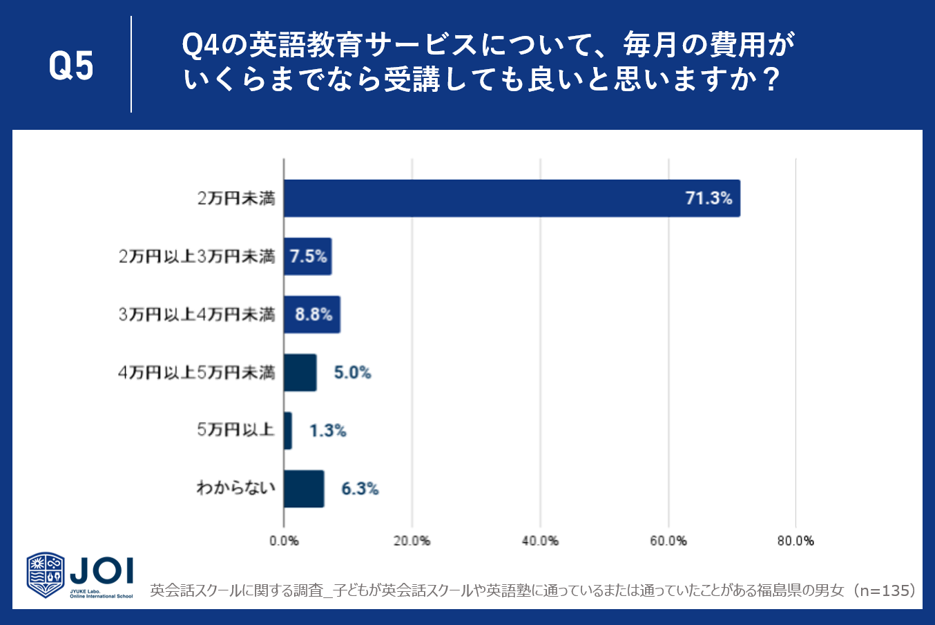 Q4で「受講したい」「料金が安ければ受講したい」「興味がある」と回答した人に、Q5で、「Q4の英語教育サービスについて、毎月の費用がいくらまでなら受講しても良いと思いますか?」と質問したところ、最も多い71.3%の回答者は2万円未満が適切と感じています。7.5%は2万円以上3万円未満、8.8%は3万円以上4万円未満と答えました。対照的に、4万円以上の費用を考える回答者は極少数で、4万円以上5万円未満が5.0%、5万円以上が1.3%でした。これにより、福島県では多くの人が3万円未満の価格帯を望んでいることが明らかとなりました。