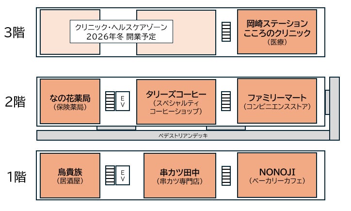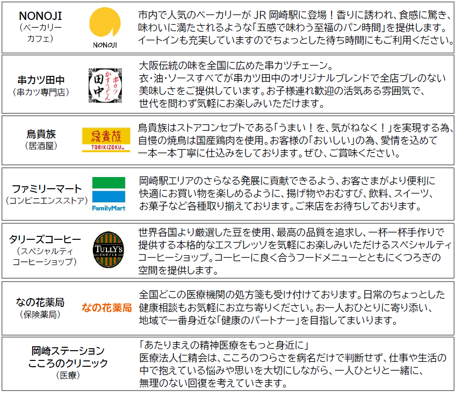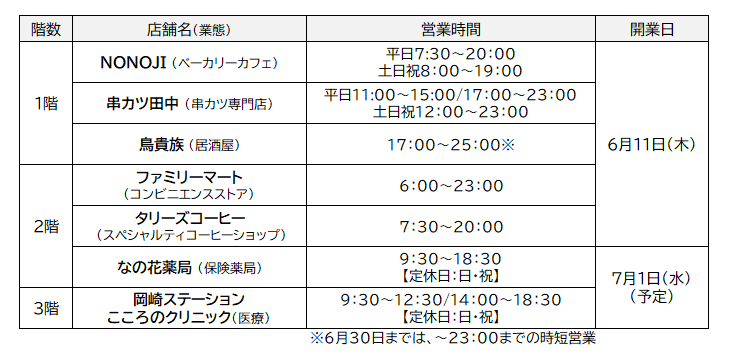 名古屋ステーション開発株式会社は、JR岡崎駅東口において複合施設の開発を計画し、2025年4月より工事を開始しておりましたが、この度、開業日、出店店舗が決まりましたのでお知らせします。