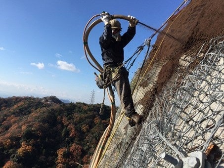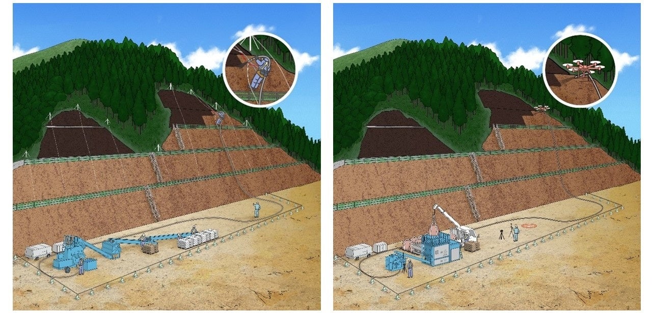 東興ジオテックは、従来の植生基材吹付工法では施工が困難だった法面垂直高80m以上の現場を吹付可能にしたハイグリーンショット工法(長距離高揚程植生基材吹付工法)と、通常の植生基材吹付工法で必要な吹付前に法面全面に金網を張り付ける工程を省略できるノンラスグリーン工法をベースに、ドローン施工を組み合わせる新しい吹付工法を「グリーンインパルス」と名付け、山腹崩壊地をはじめとする長距離高揚程圧送が必要な現場の新たな技術として活用を目指します。