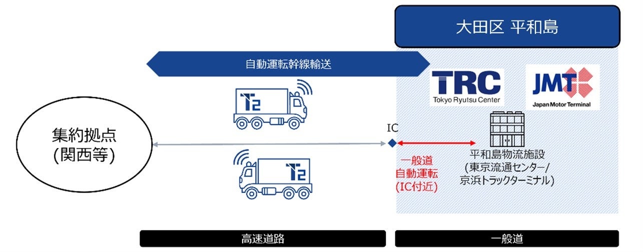 株式会社東京流通センター(東京都大田区、代表取締役社長:有森 鉄治、以下「TRC」)、日本自動車ターミナル株式会社(東京都千代田区、代表取締役社長:黒沼 靖、以下「JMT」)および株式会社T2(東京都千代田区、代表取締役 CEO:森本 成城、以下「T2」)は、レベル4自動運転*¹トラックによる幹線輸送*²の実現に向けて、東京都大田区平和島の一部一般道区間における自動走行を前提とした走行ルートの検討や自動運転トラックの受け入れ方法を検討することで合意しました。