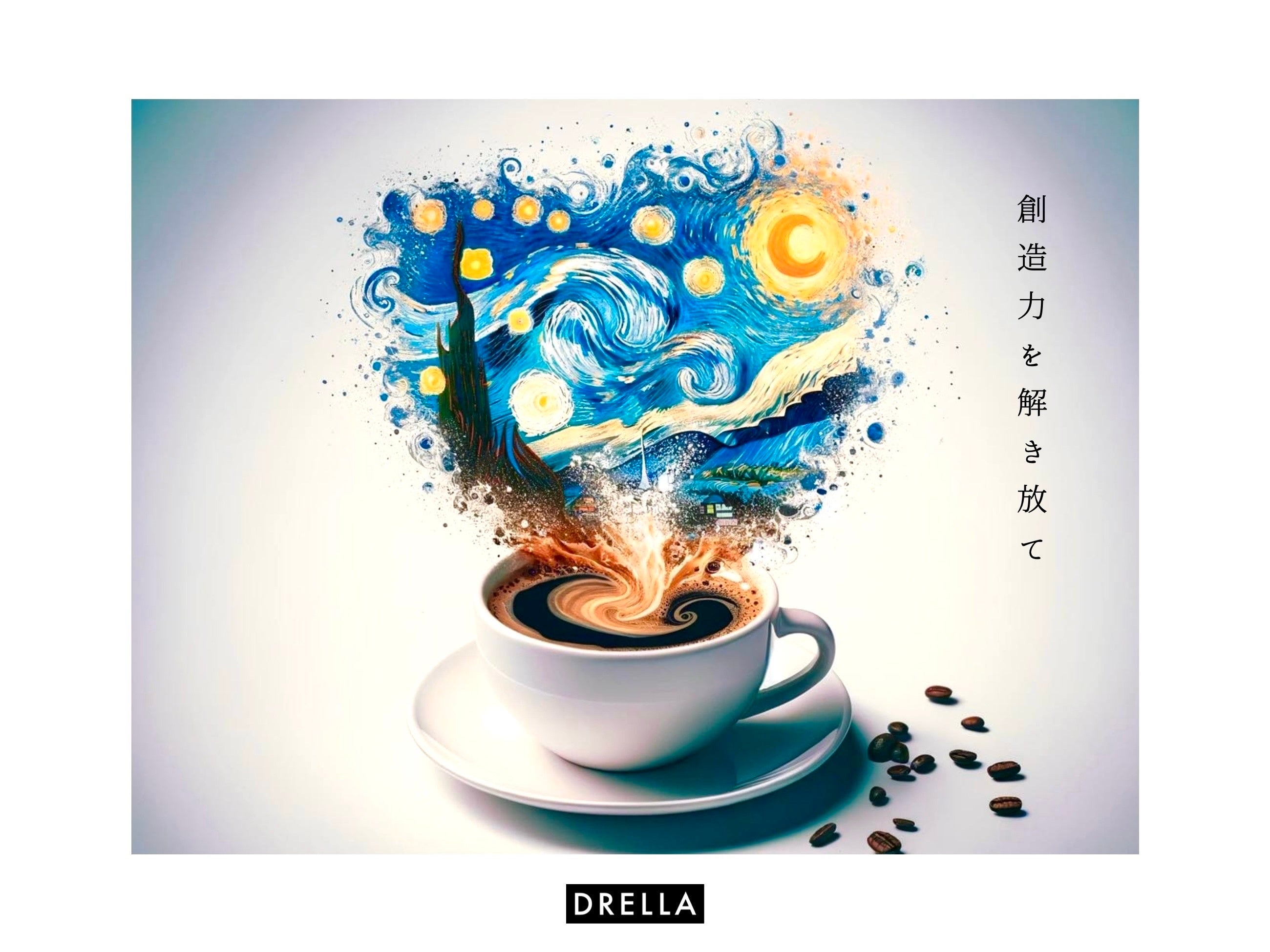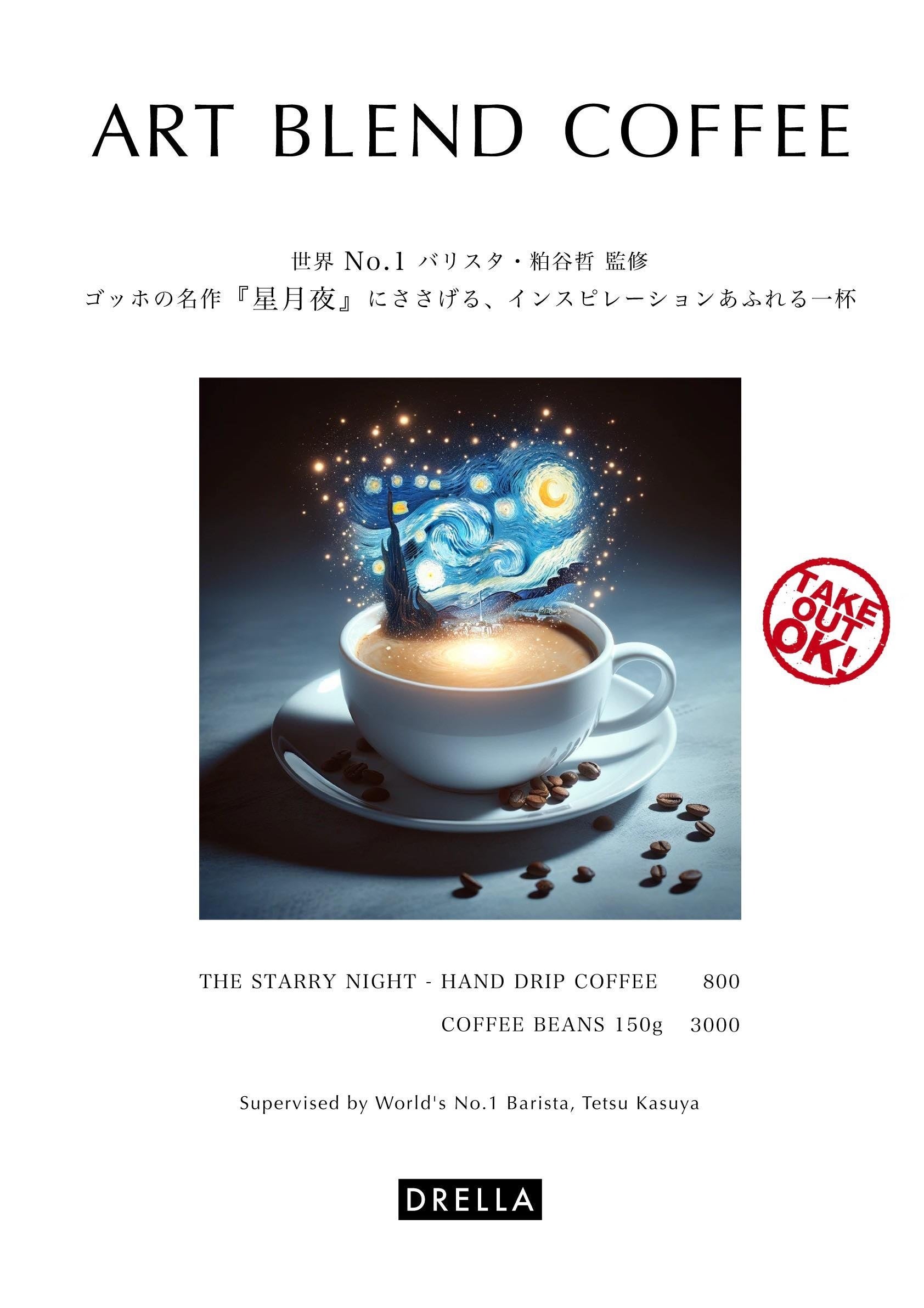 「DRELLA」では、2月1日より、ギャラリーに併設するコーヒースタンドで、新メニューとしてアートブレンドコーヒー「星月夜(The Starry Night)」を、粕谷氏の指導によるハンドドリップのレシピで提供する。価格は、一杯800円(ホット又はアイス)、コーヒー豆150gが3,000円。また、名画をテーマにしたアートモクテル(ノンアルコールカクテル)の提供も同時に開始する。各ドリンクに、作品解説のエデュケーションカードが添えられており、ドリンクとともに名画のストーリーを楽しむことができる。
