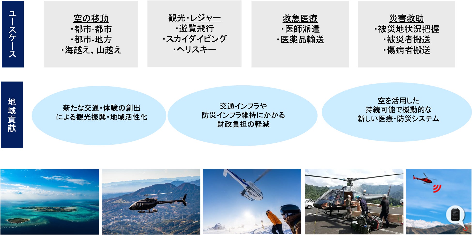 今回の資金調達では、海外展開に向けたロールアップM&Aの実行資金として活用することを主な目的としています。これにより、海外市場の獲得に加え、国内外における航空人材の育成・交流、そして機体・部品等の調達力を強化してまいります。また、2030年頃に到来が予測される「空飛ぶクルマ」時代を見据え、既存の運航・整備基盤として次世代エアモビリティを活用した新しい移動インフラ構築の推進を目指します。