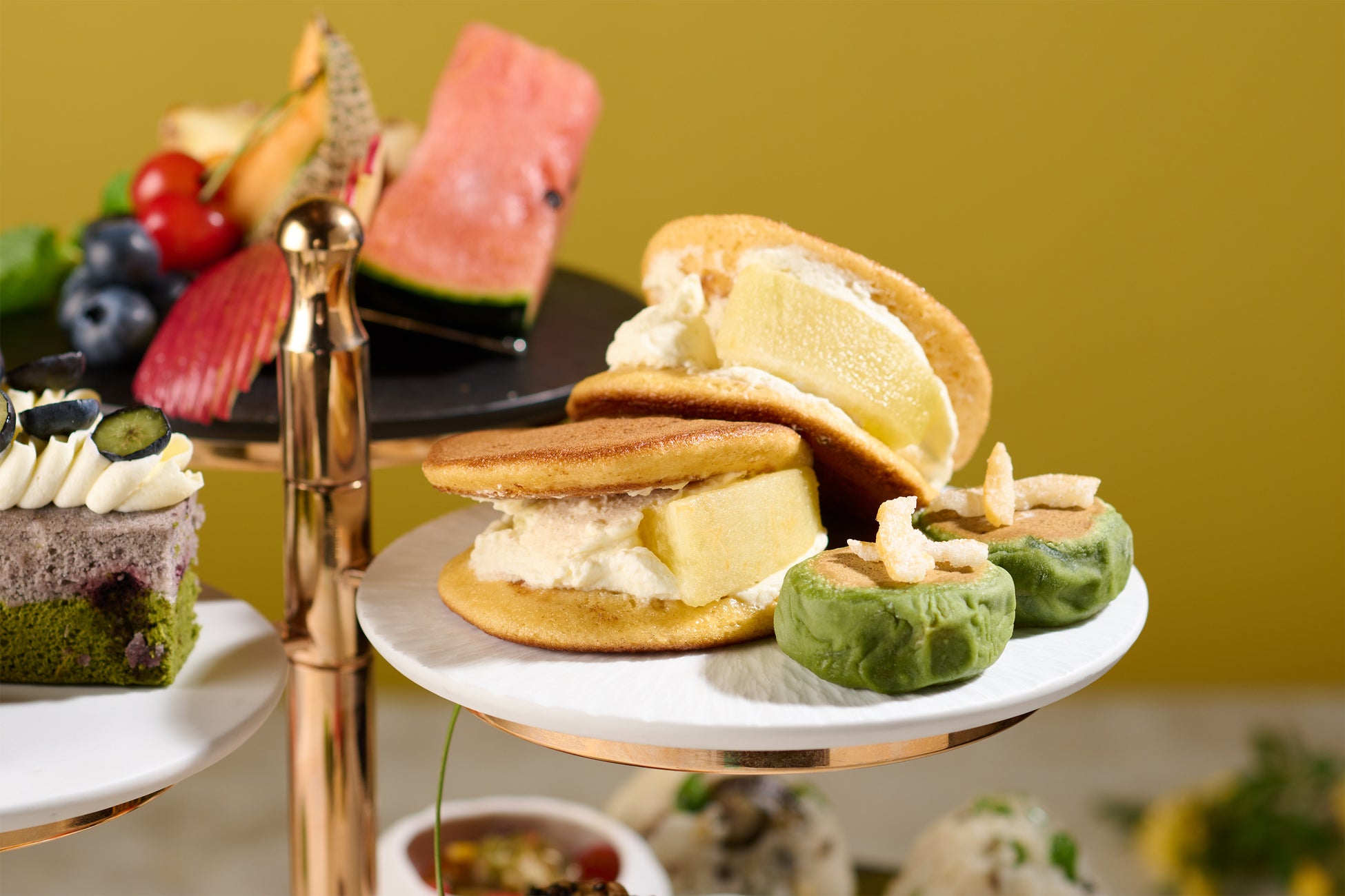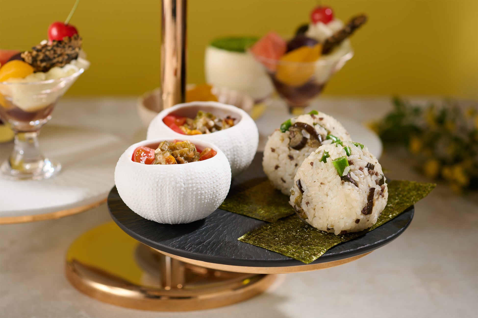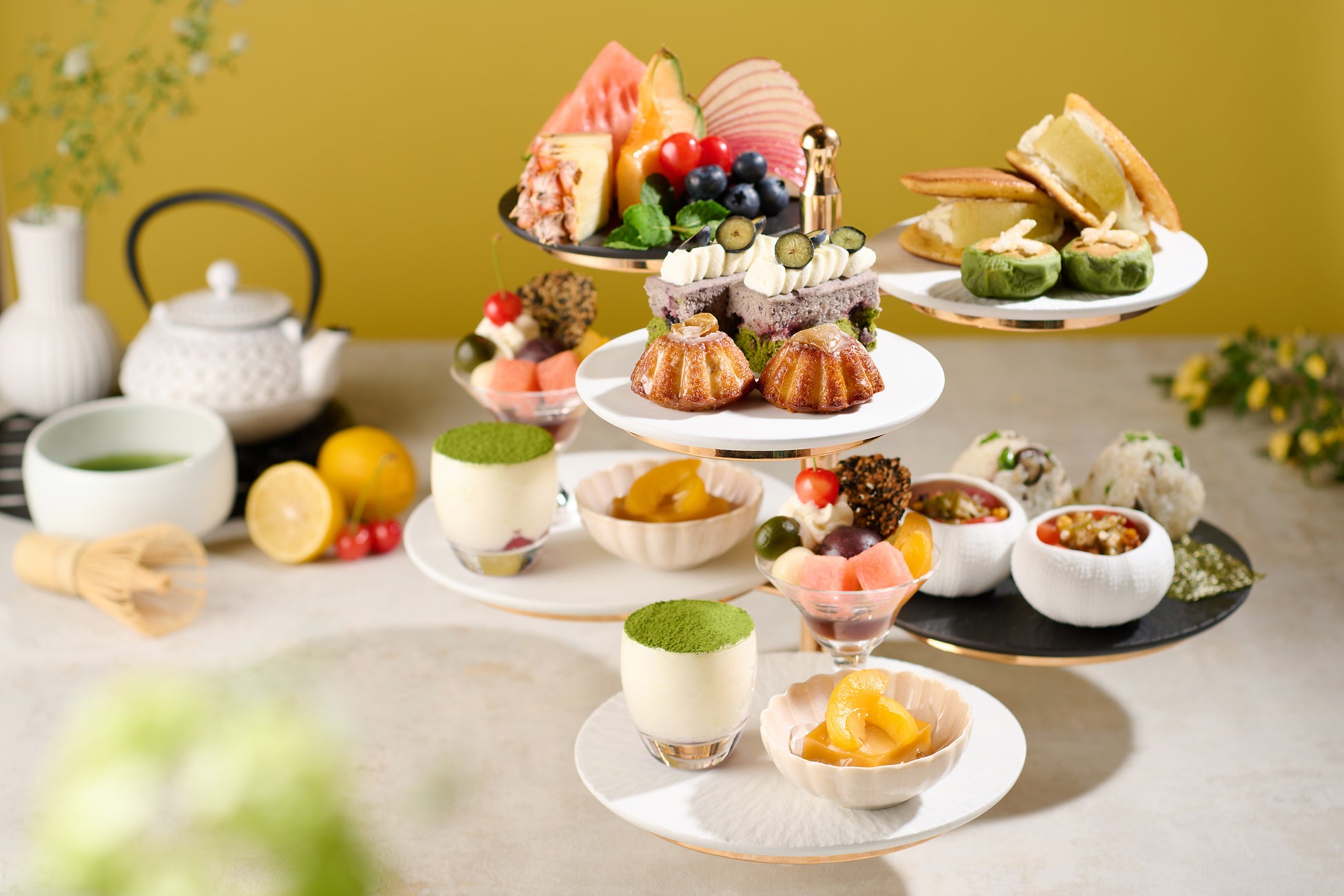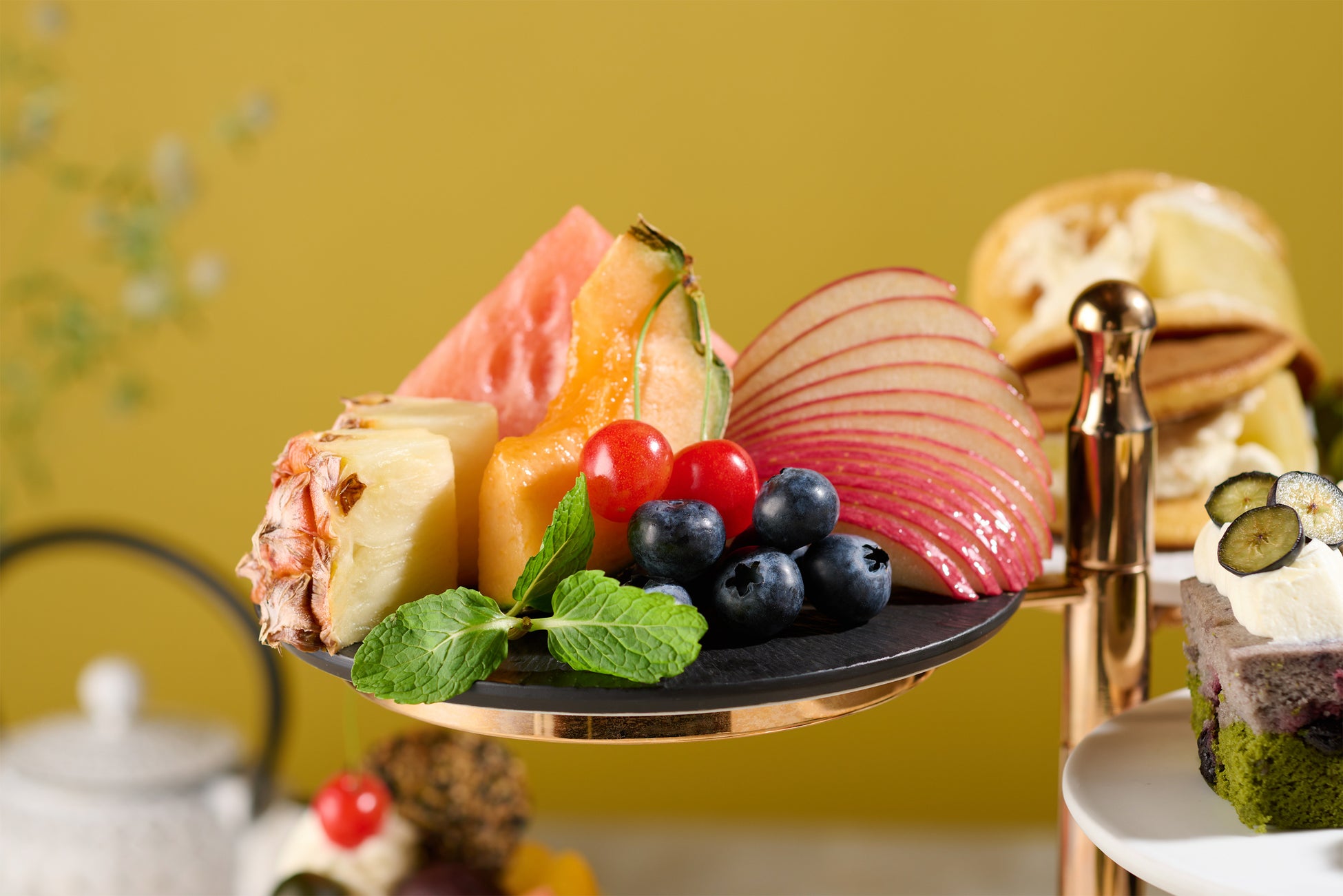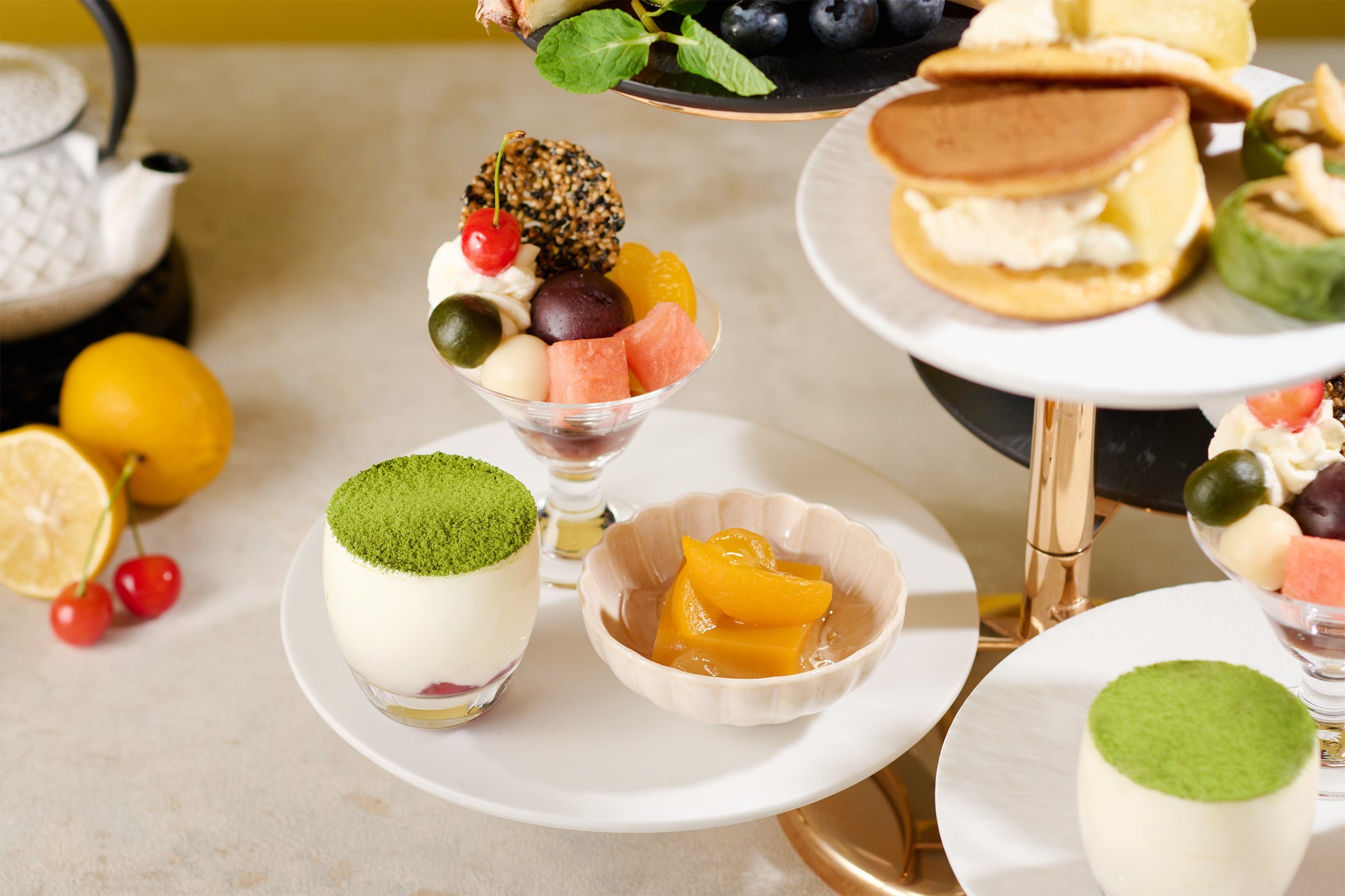 今回のアフタヌーンティーでは、「和」をテーマに、甘酸っぱい山形県産さくらんぼとマスカルポーネクリームを重ねた「さくらんぼと抹茶ティラミス」、カモミールで香り付けしたフレッシュメロンを挟んだ「メロンのどら焼き」、すいか・あんず・パイナップルなどの初夏のフルーツをたっぷりと使用した「すいかのあんみつ」など、抹茶や和菓子と季節のフルーツが織り成す、繊細なスイーツを取り揃えました。