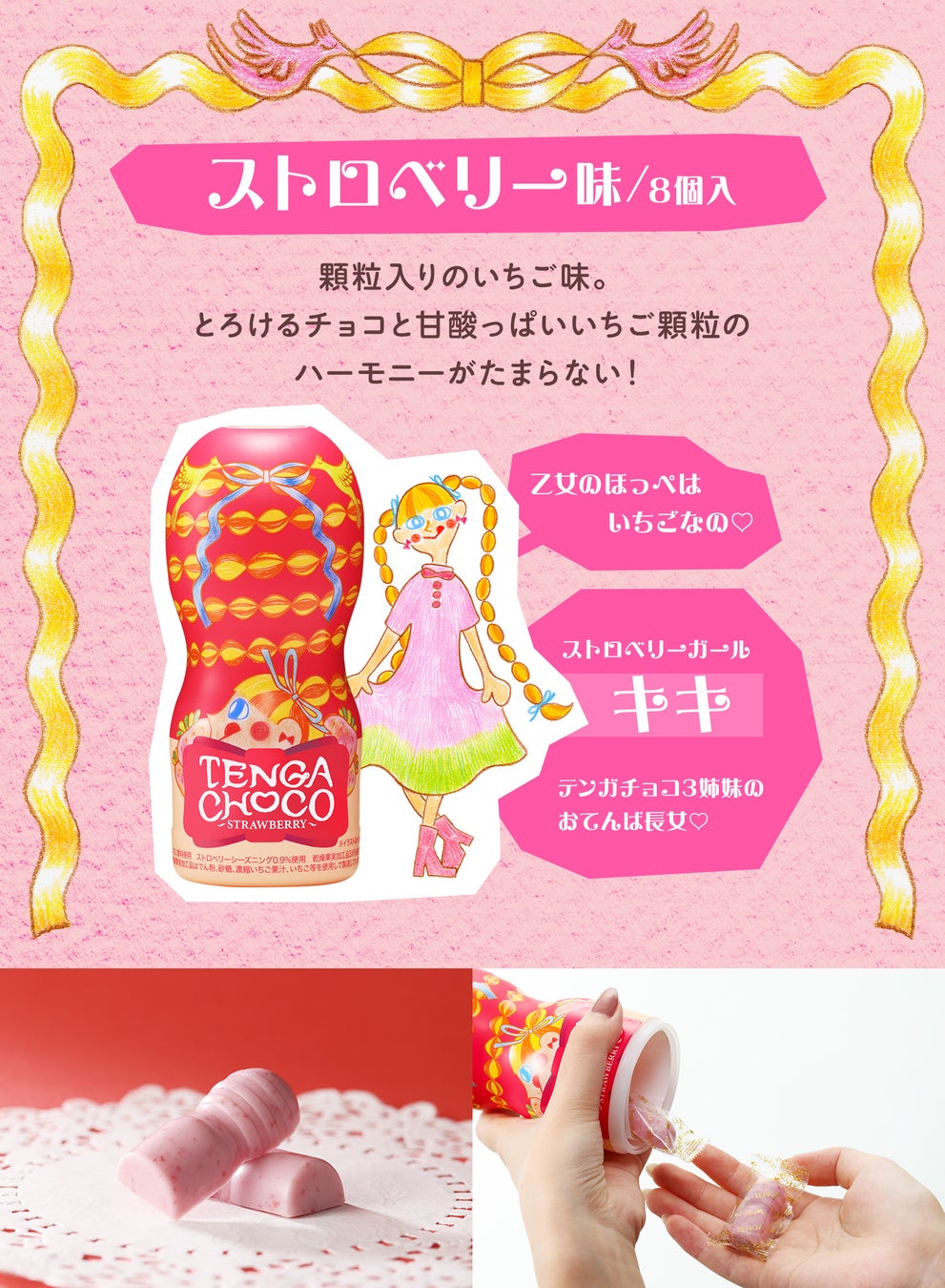 2018年より毎年パッケージやフレーバーを新たにし、発売しているTENGAチョコレート。今年は「トキメキ」をテーマに、それぞれのフレーバーをイメージした三姉妹が登場。リボンモチーフでギュッとラブリーなデザインに仕上げています。定番の「ハイカカオ」「ストロベリー」のほか、「抹茶」が5年ぶりにリニューアルして再登場。また3種のフレーバーが入った、ひとまわり大きいアソートカップが新発売です。