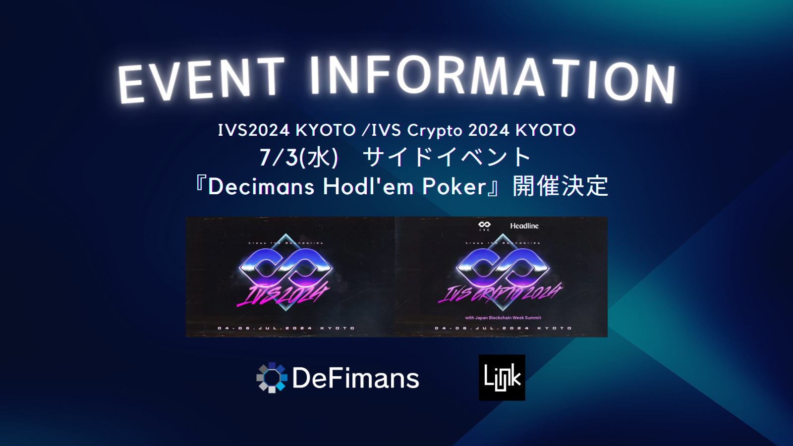 株式会社DeFimans(所在地:東京都港区、代表取締役:小野 暢思・佐藤 太思、以下「DeFimans」)は、2024年7月4日(木) 〜 7月6日(土)の3日間、京都府にて開催される国内最大級のスタートアップカンファレンス「IVS2024 KYOTO / IVS Crypto 2024 KYOTO」のサイドイベントとして「Decimans Hodl'em Poker」を開催することをお知らせいたします。