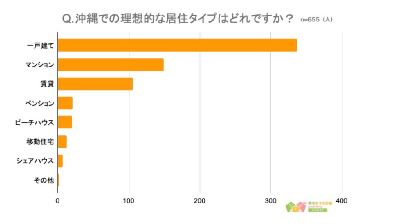 また、「沖縄での理想的な住居タイプ」について聞いたところ、「一戸建て」と答えた人が1位で337人、「マンション」が2位で149人、「賃貸」が3位で106人という結果になりました。半数以上の人が一戸建てに住んで沖縄生活を楽しみたいと思っていることがわかります。
