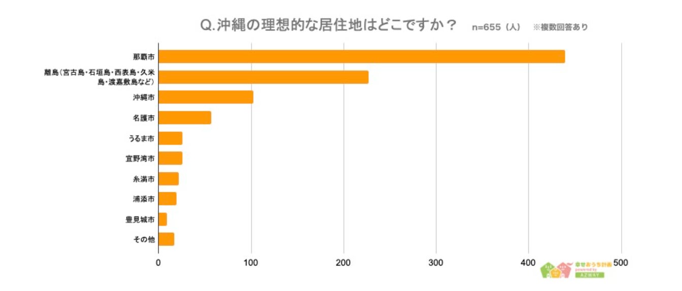 また、沖縄で住みたいのは県庁所在地である「那覇市」が1位、「沖縄市」が3位という結果に。自然を楽しみながらも、ある程度の賑わいを楽しみ、利便性も重視したいと考えている人が多いとわかります。一方、離島が2位にランクインしており、都会の喧騒から一線を引いて、のんびり過ごしたい人も多いとわかりました。