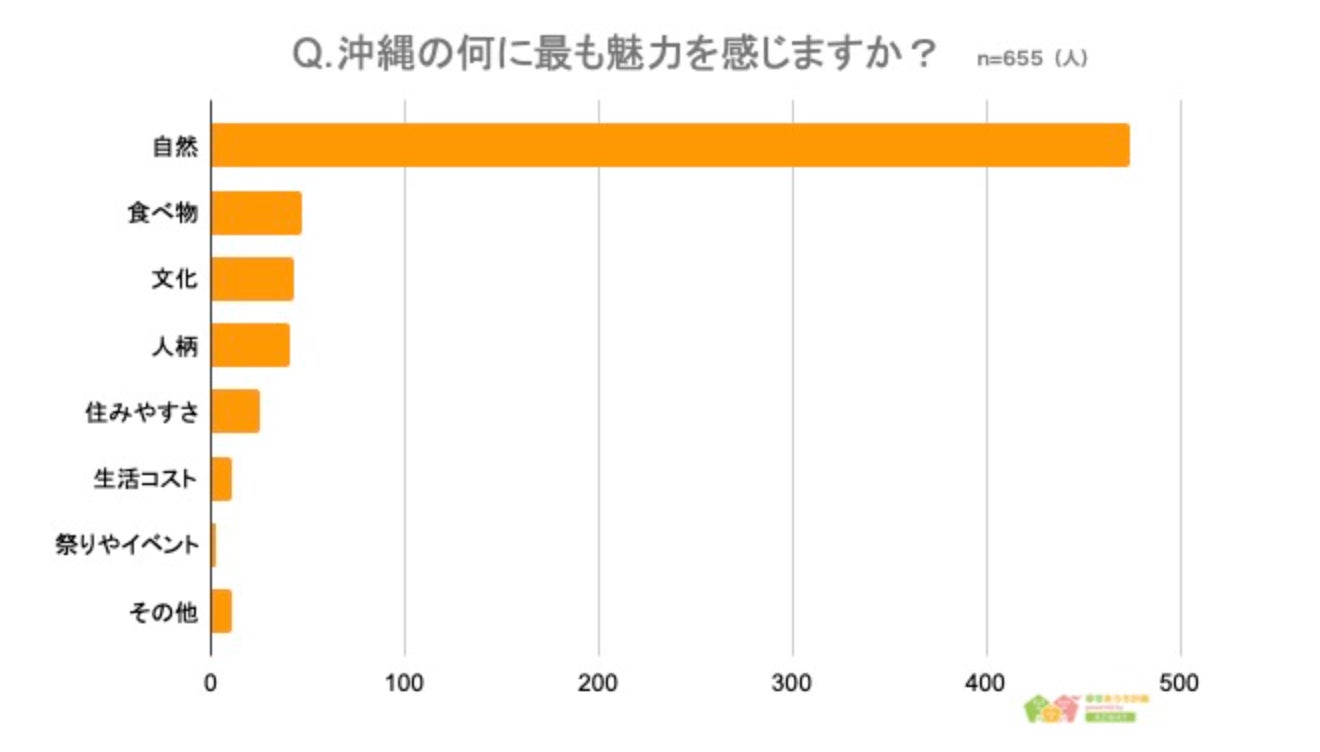 実際、「沖縄の何に最も魅力を感じるか」と聞いたところ、「自然」と回答した人が474人と圧倒的に多い結果に。繁華街のある那覇市や沖縄市を選んだ人も離島を選んだ人も、その多くが沖縄の豊かな自然を求めているとわかります。