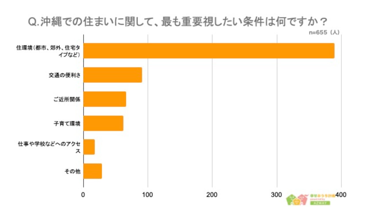 最後に、「沖縄の住まいに求めるもの」について聞いたところ、「住環境」が1位で389人、「交通の便利さ」が2位で91人、「ご近所関係」が3位で66人という結果になりました。家の外では美しい自然環境を求めるものの、自分が暮らす家については快適と思える状況を整えておきたい人が多いとわかります。