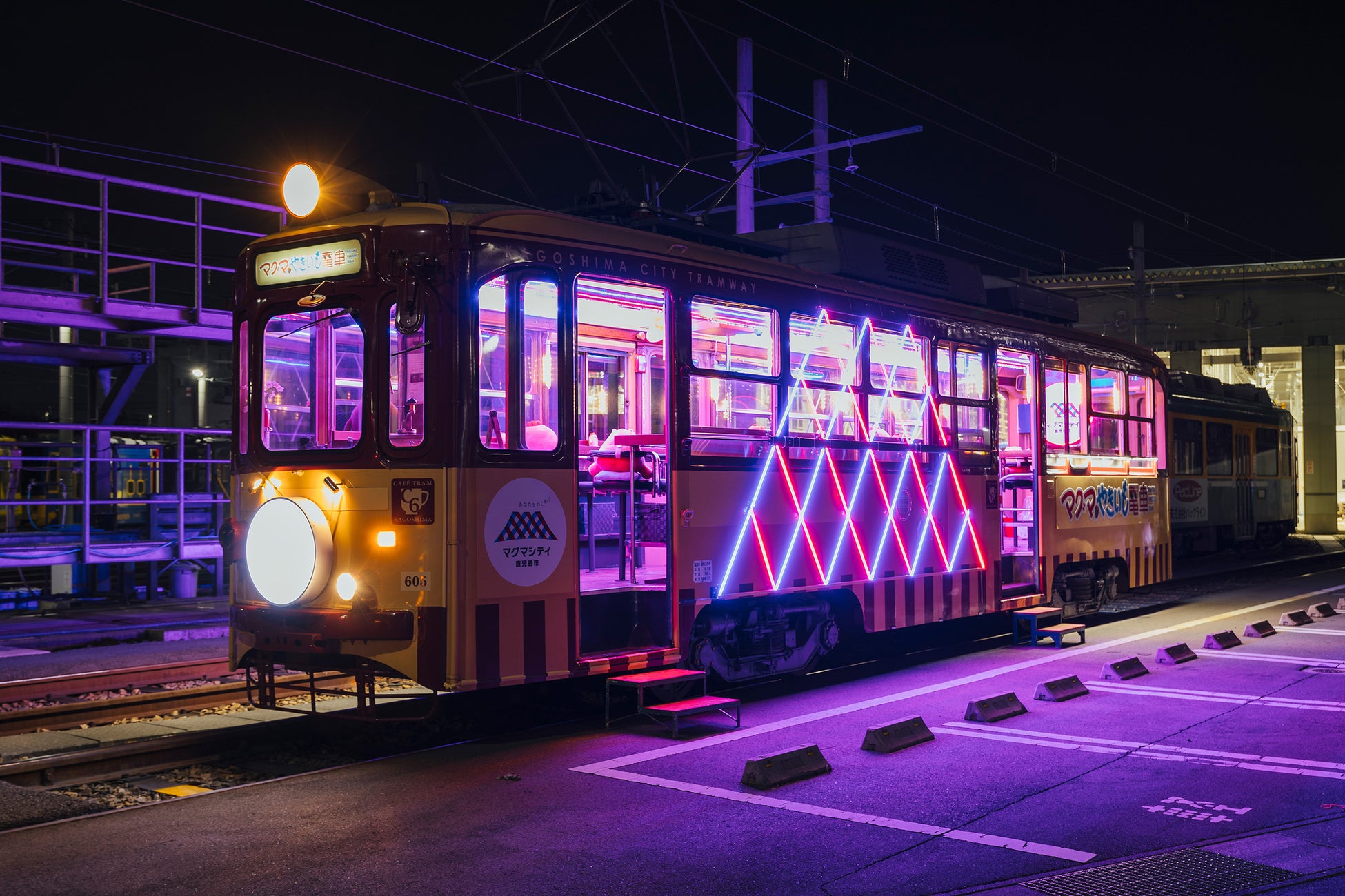 マグマシティのロゴをイメージしたLEDで光り輝く特別装飾の路面電車で、市内を回遊。