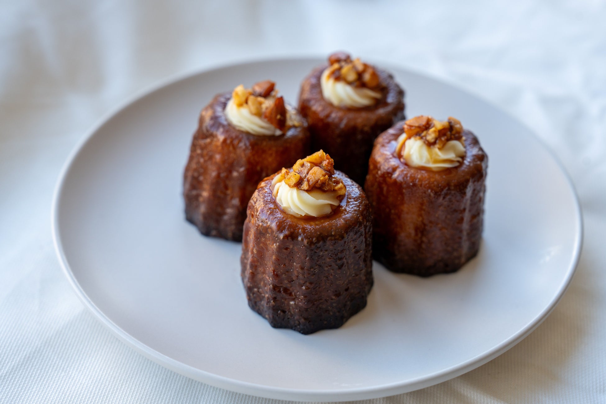 ホワイトチョコの優しい甘さのカヌレ生地に、藻塩を隠し味に少し塩味をきかせたホワイトチョコのガナッシュとキャラメルナッツをトッピングしています。