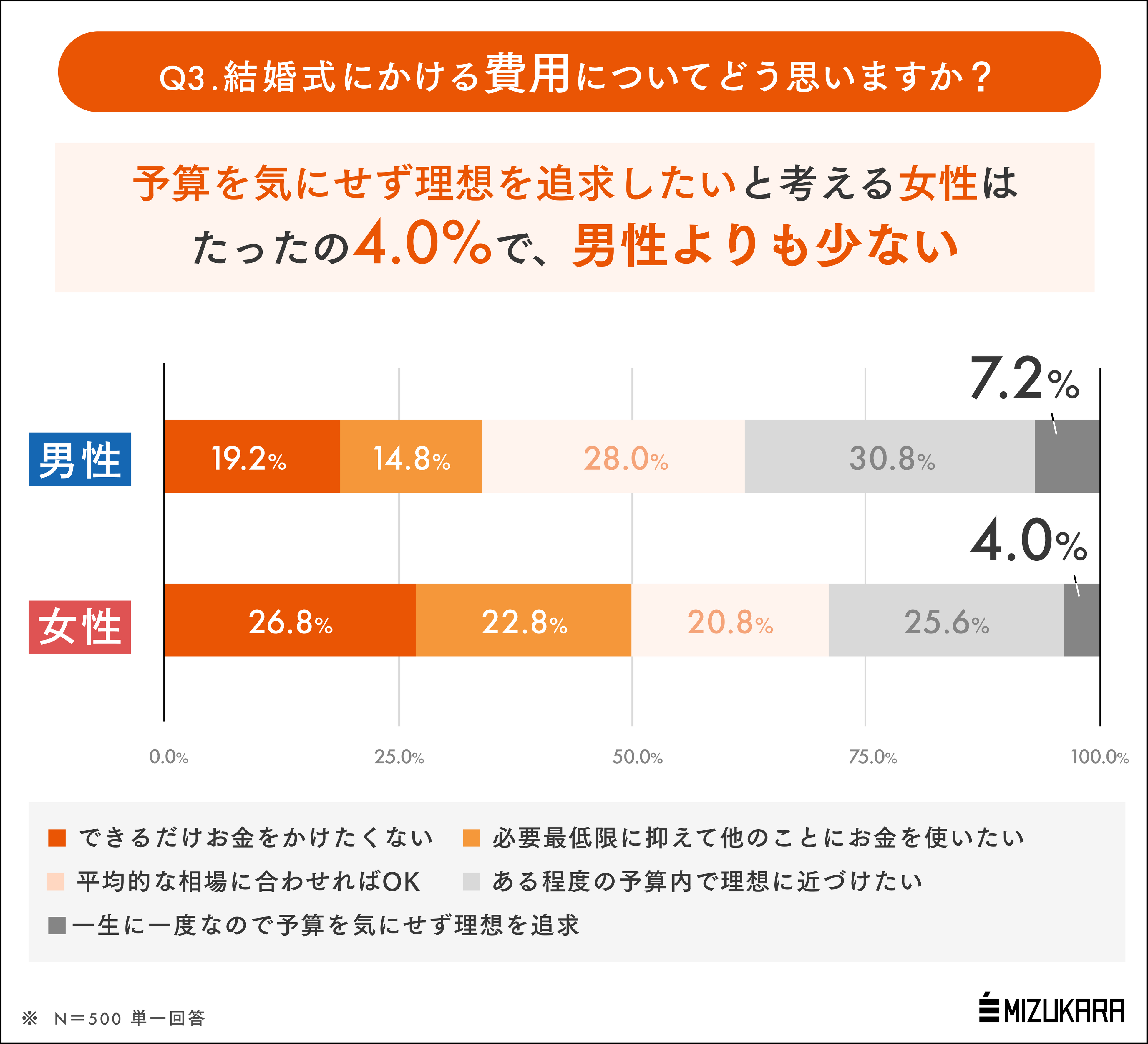 結婚式に対する温度感は圧倒的に高い女性ですが、挙式にかける費用については一転シビアになります。「一生に一度の大事なイベントだから、予算を気にせず理想を追求したい」と考える女性はたったの4.0%で、男性よりも少ないことが判明。約半数(49.6%)の女性はなるべくお金をかけず、他のことにまわしたいと考えているようです。