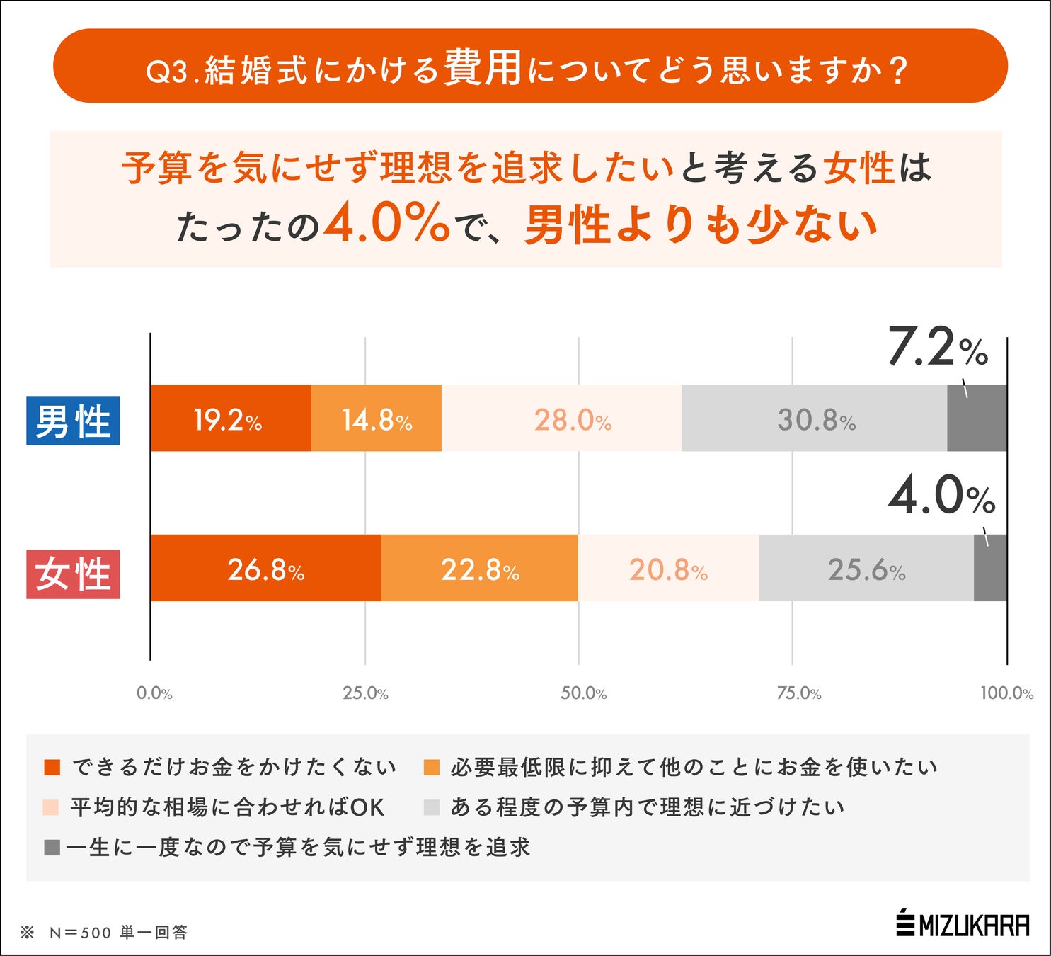 認知科学に基づくコーチングを法人・個人に提供する株式会社ミズカラ(本社:東京都千代田区、代表取締役 山宮健太朗)は、このたび25歳~59歳の既婚有職男女500名を対象とした「結婚式に対する男女の意識差」に関する意識・実態調査を行いました。