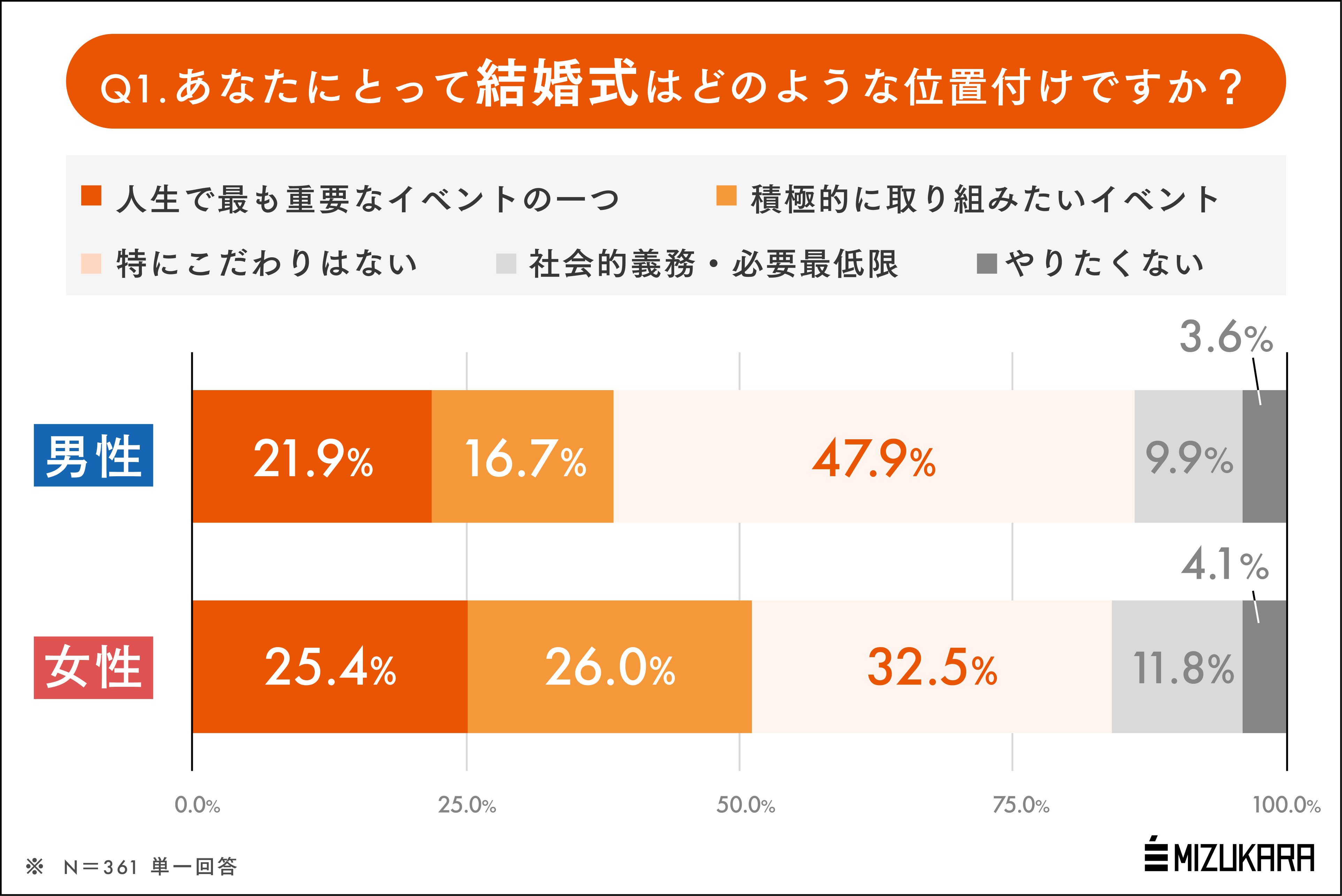 人生のハイライトともいえる結婚式ですが、主役の2人=男性と女性それぞれで捉えかたに差はありそうですよね。そこで、まずは自分にとっての「結婚式の位置づけ」について聞いてみました。