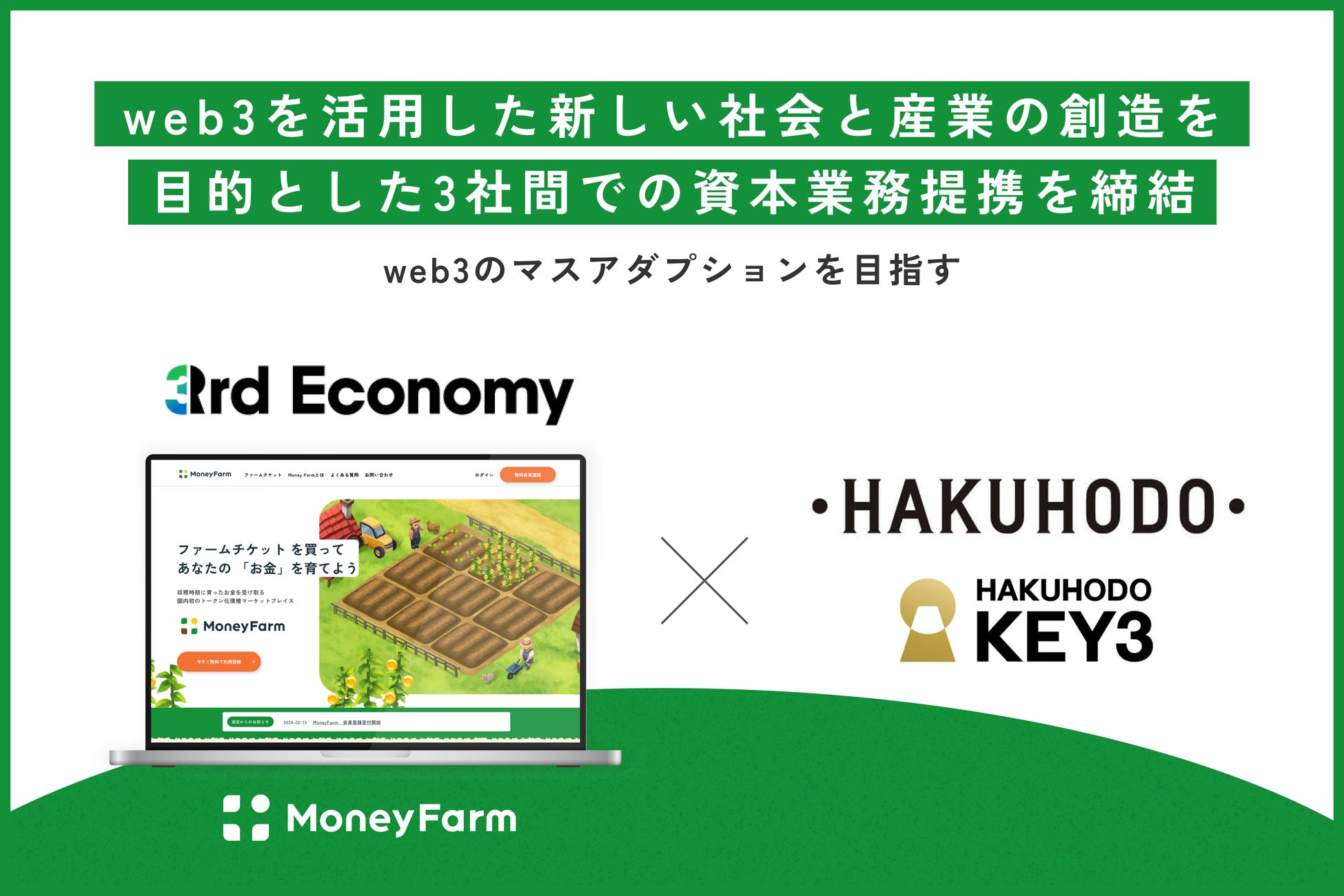 株式会社博報堂キースリー(本社:東京都港区、代表取締役社長:重松 俊範、以下、博報堂キースリー)は、「新しい資産運用体験の提供」並びに「成長企業の資金調達方法の多様化」を目指すトークン化金銭債権のマーケットプレイスサービス 「Money Farm (マネーファーム)」を提供する株式会社3rd Economy(本社:東京都渋谷区、代表取締役:橋村純、以下、3rd Economy)と資本業務提携(以下、本提携)することをお知らせいたします。