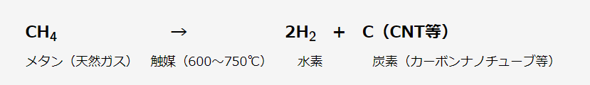 (※1) メタン直接改質(DMR:Direct Methane Reforming )法は、天然ガス等を原料として鉄系触媒等の存在下で水素と炭素を生成するクリーンな反応です。この製造方法は、水素製造時に原料ガスとなるメタン由来のCO2を発生させない、すなわちCO2フリーな反応であるため、低炭素社会に大きく貢献できる水素製造法として開発を進めてまいりました。