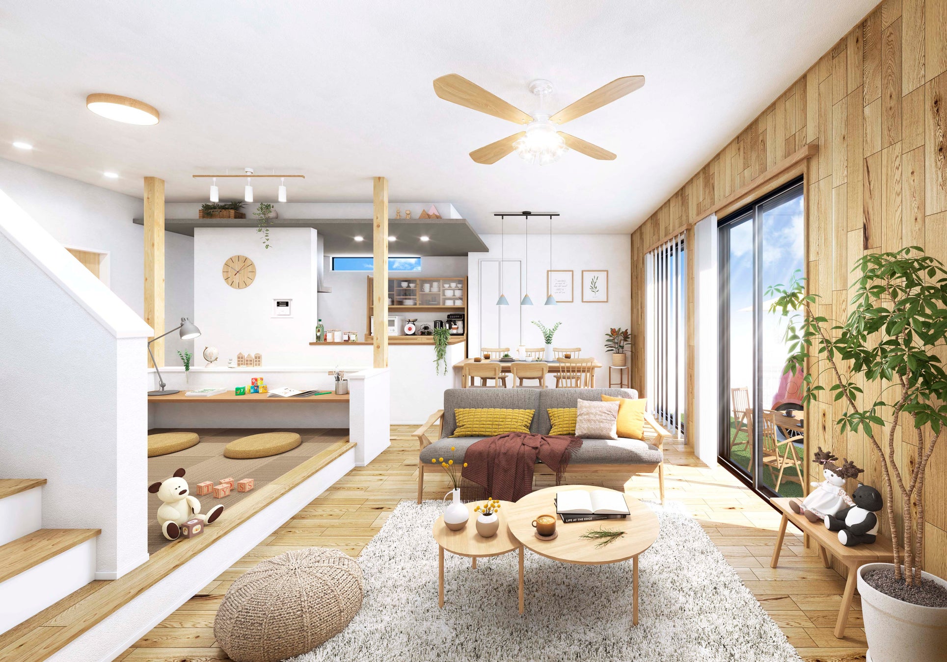 天井高2.7mの開放感あるリビングに、天然木の息吹を感じられる床や貼り上げの壁、化粧柱を施しました。家族みんなが利用しながら絆を紡ぐことができ、居心地の良い空間を創ります。